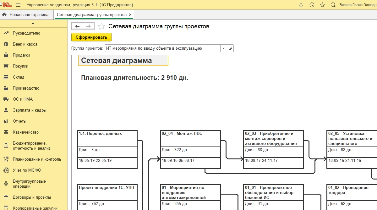 Отчет со схематичным изображением взаимосвязи стадий проекта в 1С:Управление холдингом можно представить в виде сетевой диаграммы.