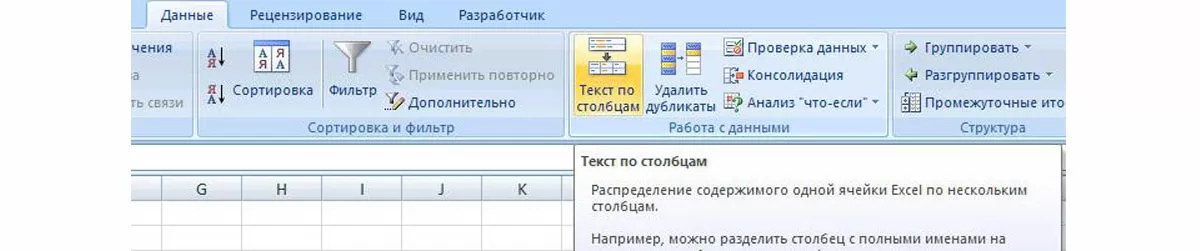 Чтобы представить полученный файл в виде таблицы в Excel, можно воспользоваться мастером импорта текста. На вкладке «Данные» есть кнопка «Текст по столбцам». Необходимо выделить наш текст, который по умолчанию сохраняется в первый столбец, и нажать на эту кнопку. После простой настройки, в течение которой вы укажете разделитель, перед нами появится таблица.