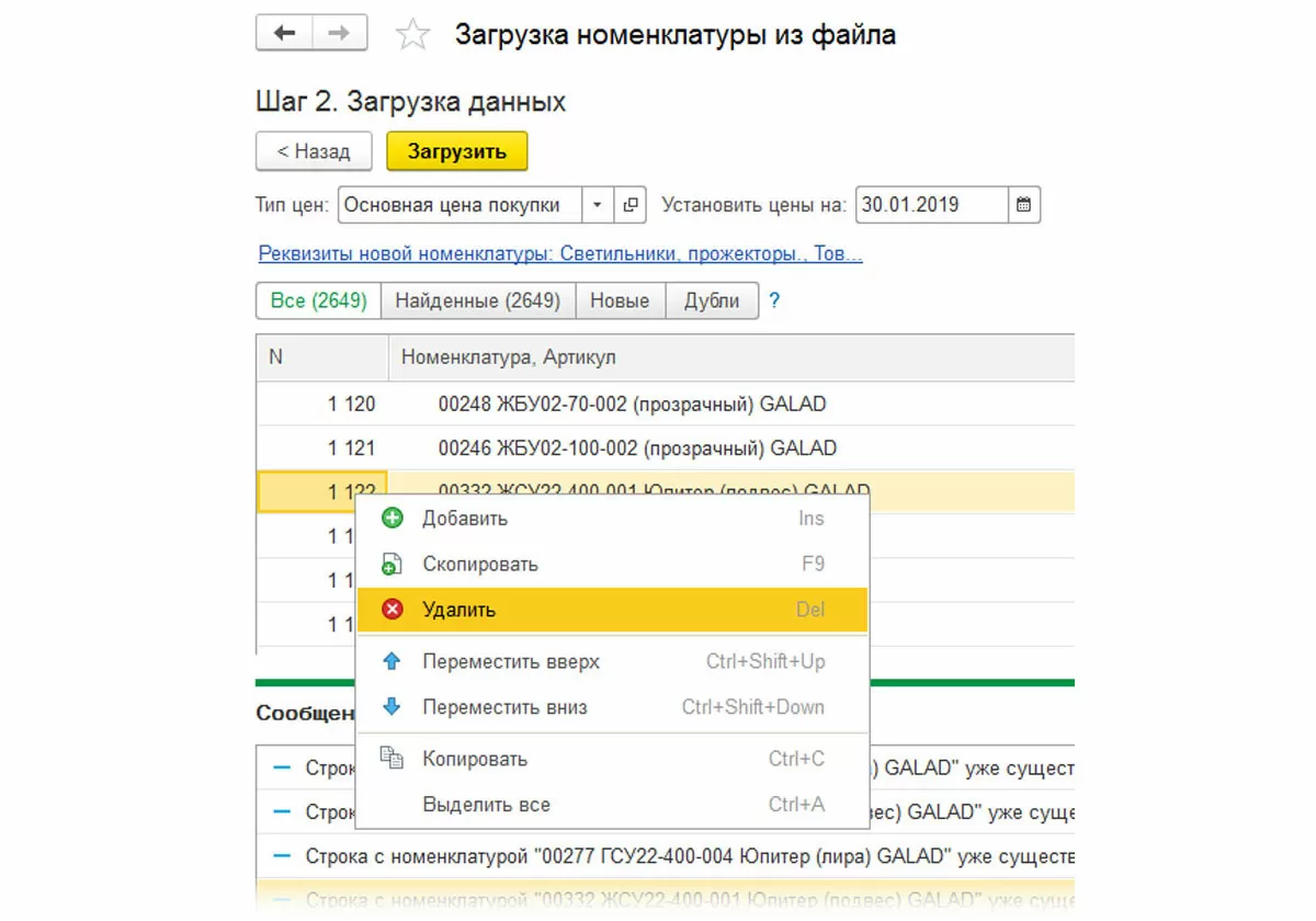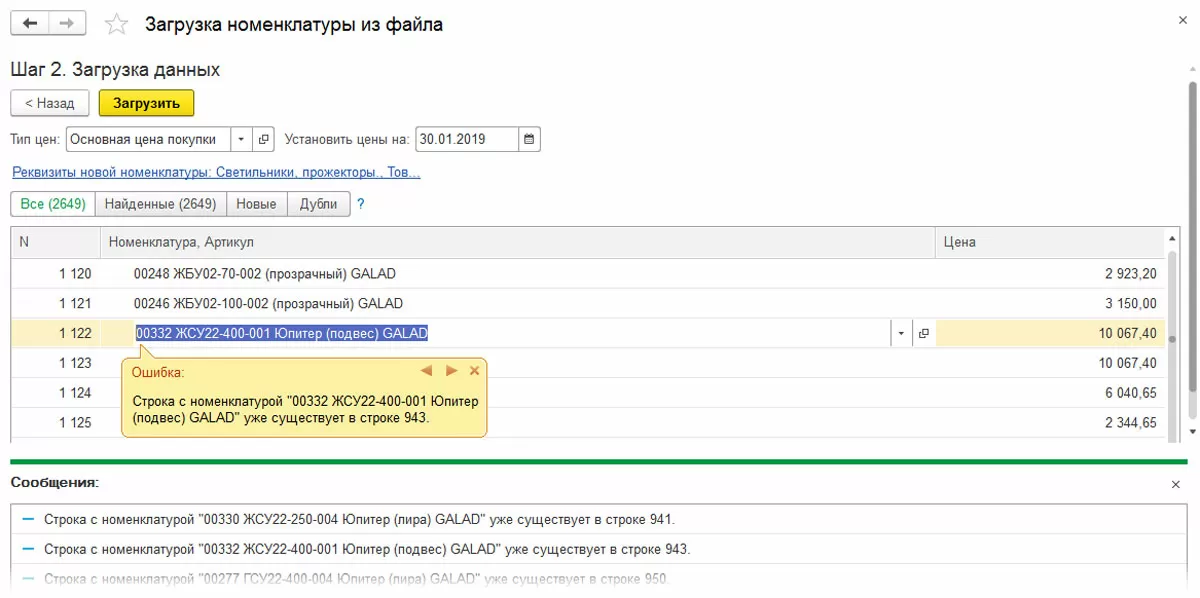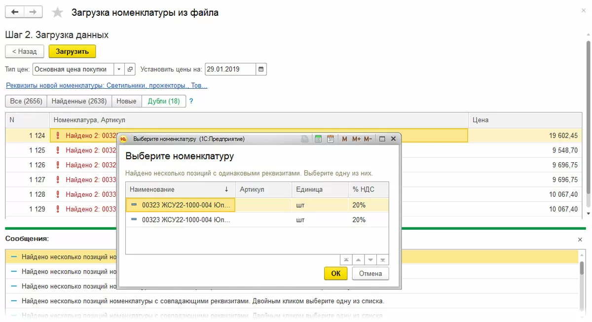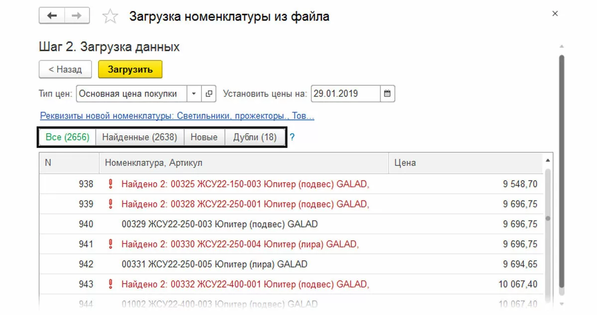 При попытке загрузки программа предупредит о наличии дублей и предложит выбрать нужную позицию.