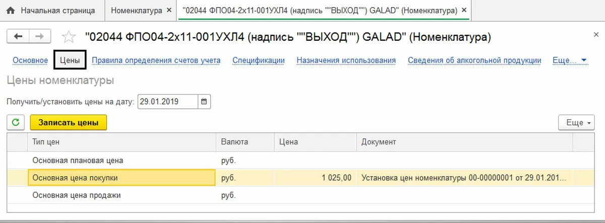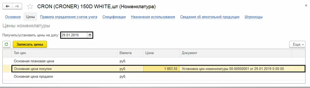 Исправив рекомендуемые программой данные, снова загружаем прайс. Посмотрим любую позицию номенклатуры, данные о ценах (справочник «Номенклатура», вкладка «Цены») изменив дату актуальности цены.