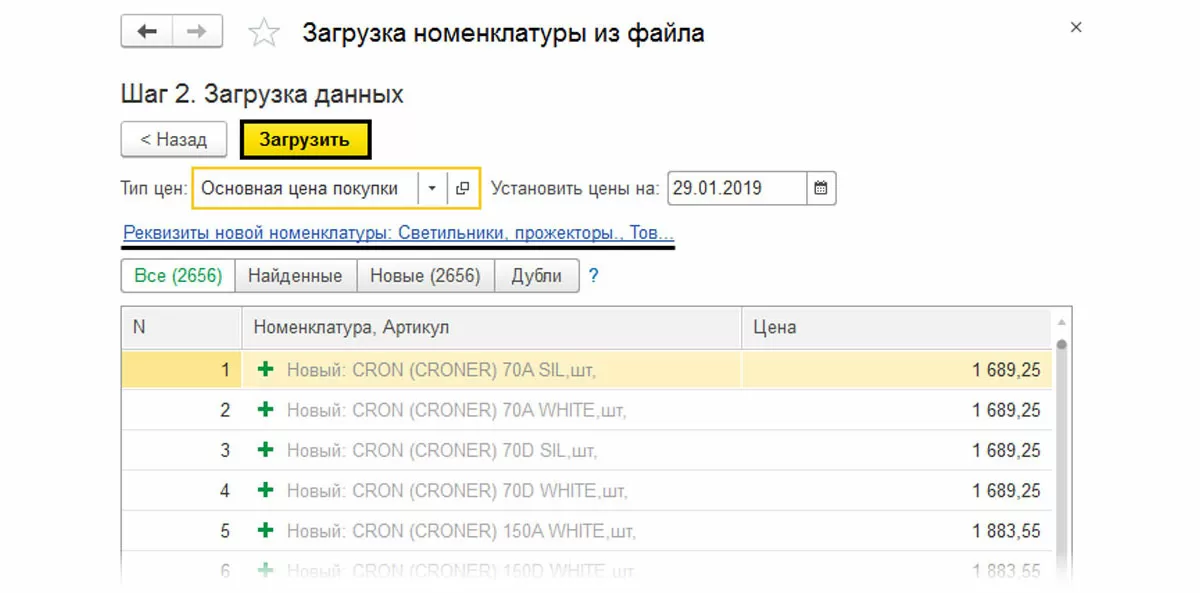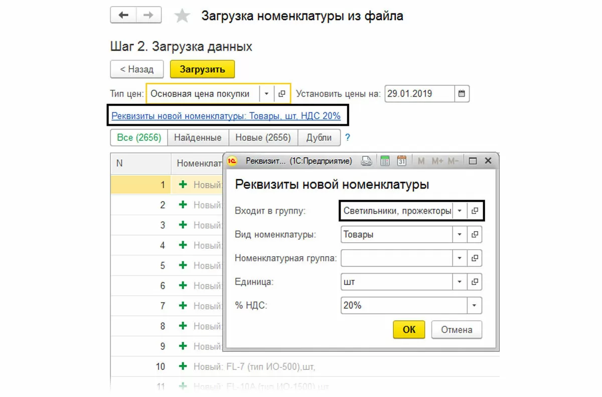 На следующем этапе программа показывает информацию о загружаемых элементах. В нашем примере все элементы новые и отмечены зеленым плюсиком. Здесь же можно задать реквизиты загружаемых элементов, нажав гиперссылку «Реквизиты новой номенклатуры». В открывшемся окне мы можем задать группу, в которую необходимо загрузить элементы, (в нашем примере мы создали группу номенклатуры «Светильники, прожекторы»), задать номенклатурную группу, единицу измерения, ставку НДС.