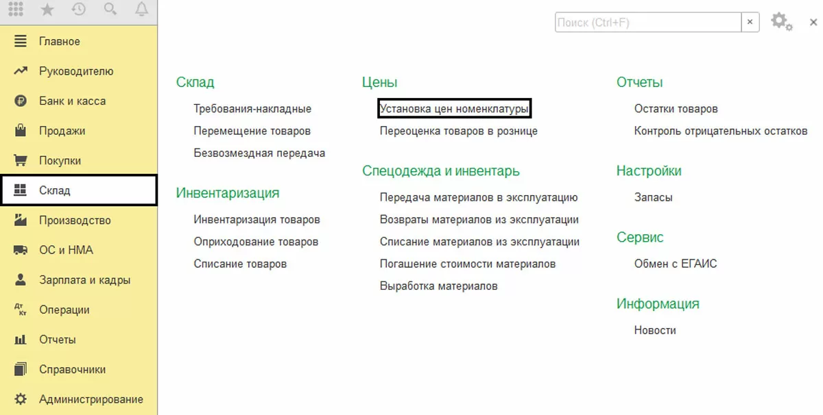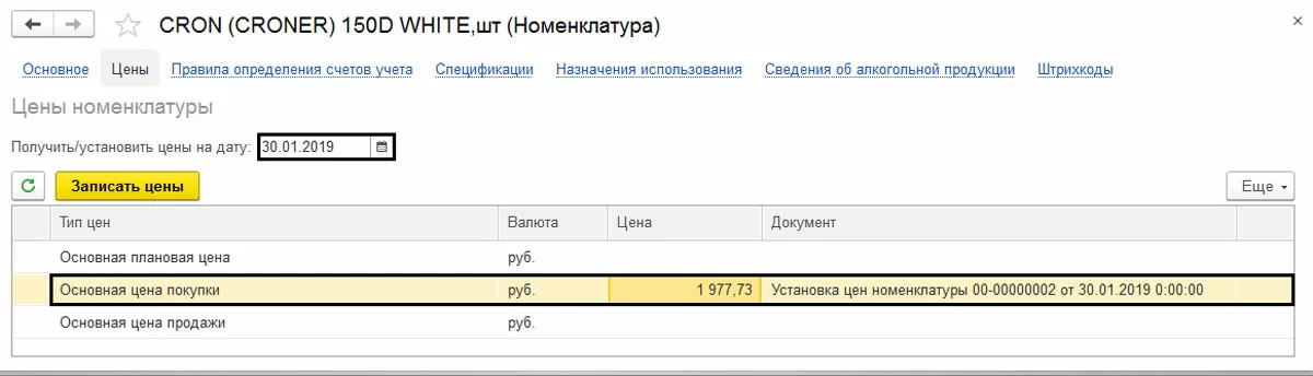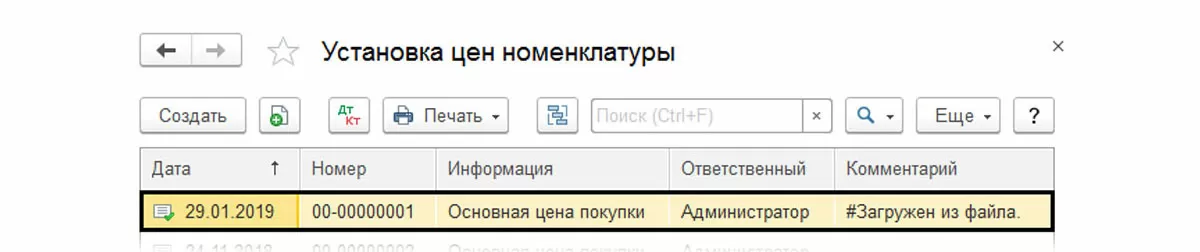 Мы видим, что цена изменена документом «Установка цен номенклатуры», сформированным при загрузке нашего нового прайс-листа.