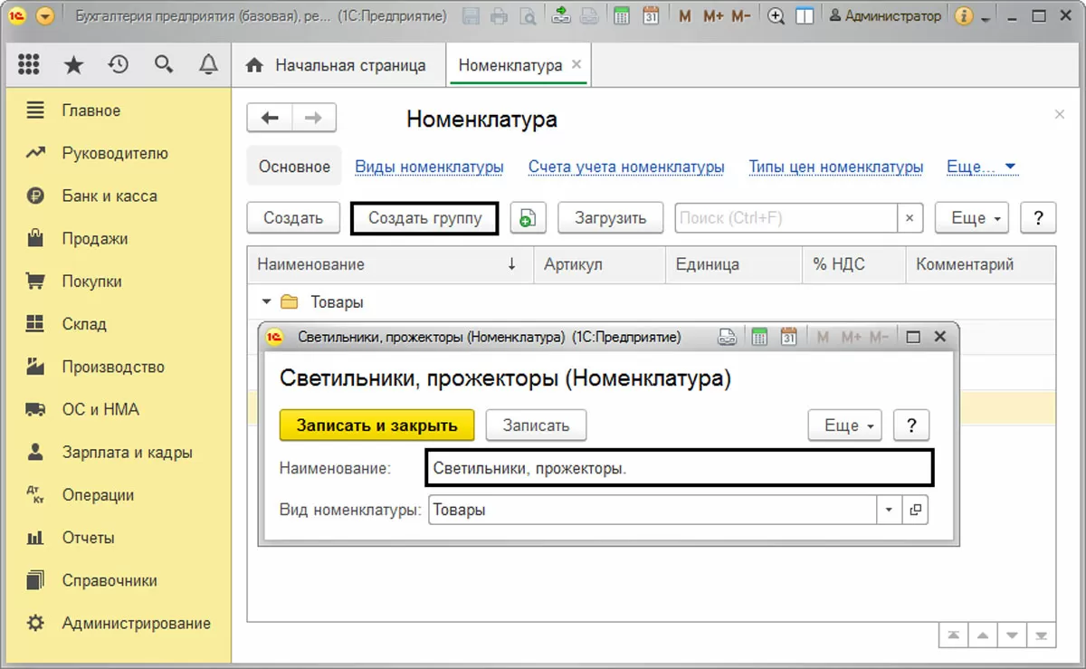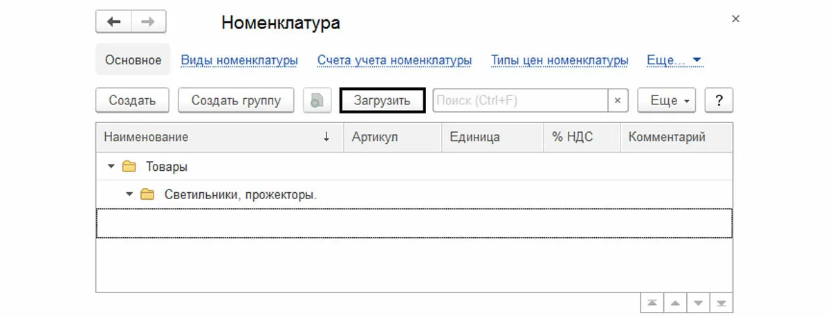 В справочнике «Номенклатура» (раздел меню «Справочники» - «Товары и услуги») создадим группу номенклатуры, для загрузки в нее новых элементов (кнопка «Создать группу»).