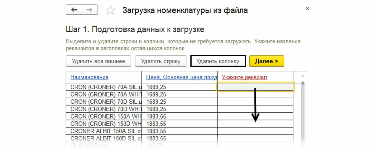 Прайс-лист может содержать и другую информацию, например, единицу измерения, артикул, рекомендуемая цена продажи и т.п. В таком случае эти данные также можно сопоставить с реквизитами в программе. Приведя таблицу в порядок, нажимаем кнопку «Далее».