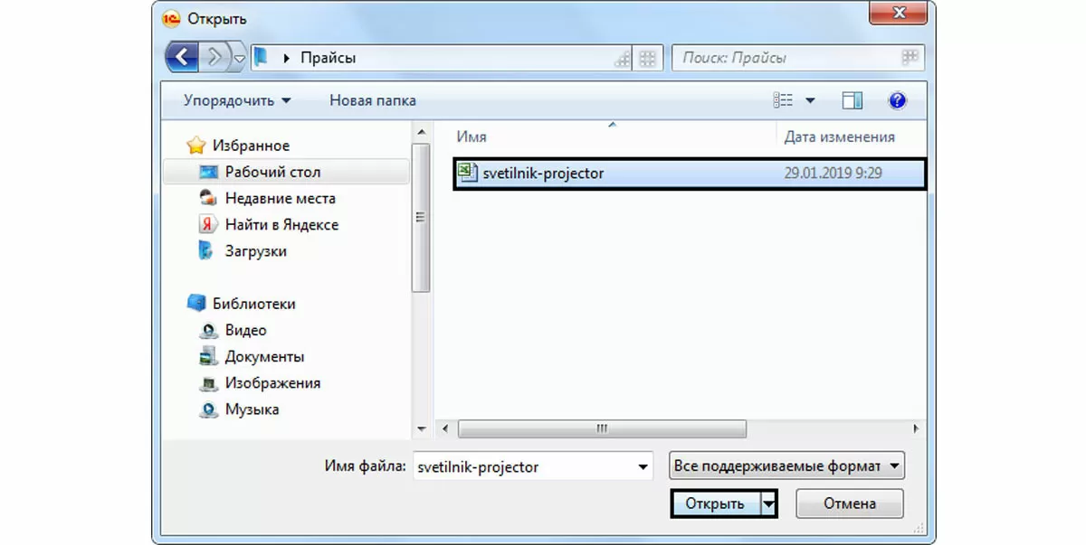 Нажимаем кнопку «Загрузить» и перед нами откроется окно выбора файла, в котором мы указываем файл нашего прайс-листа.