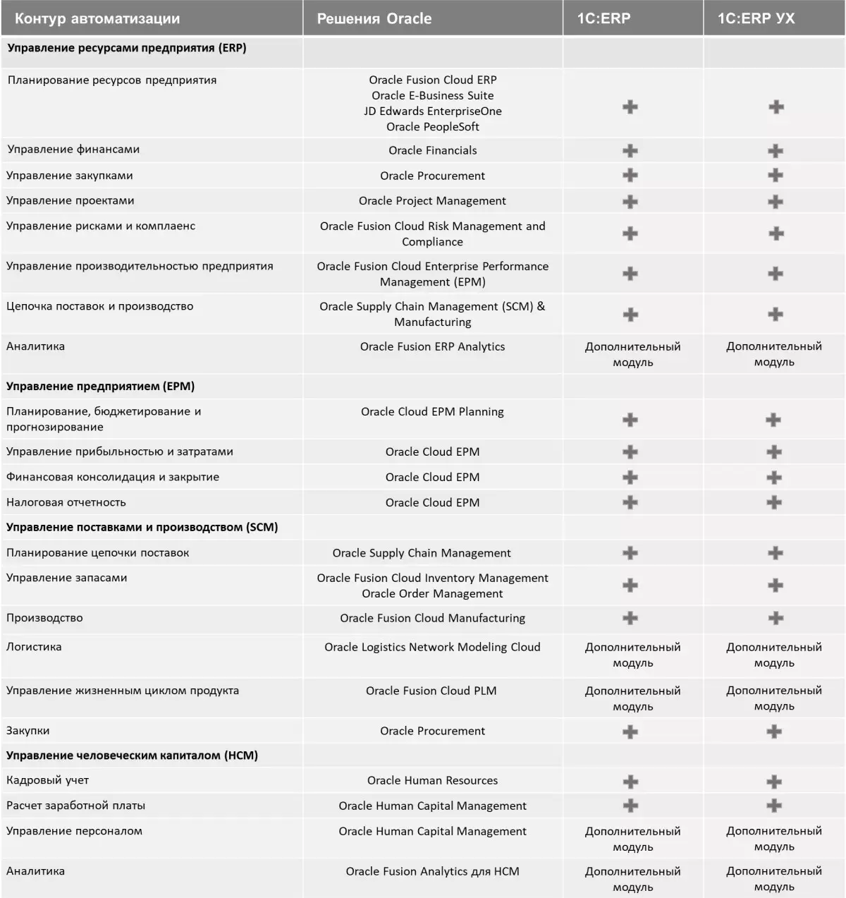 Если говорить про учетные системы Oracle, то отечественные аналоги также могут обеспечить необходимый функционал. Предлагаем ознакомиться с функциональными пересечениями систем Oracle и 1С класса ERP.