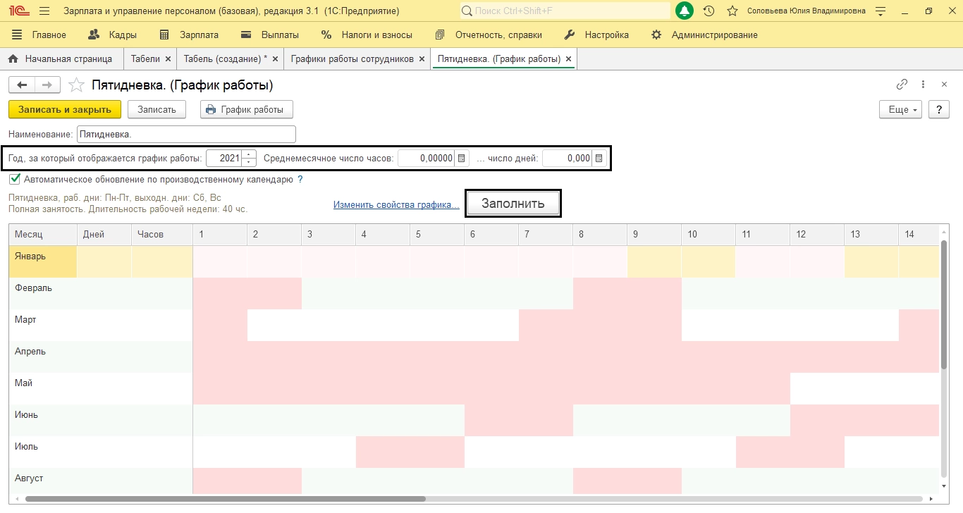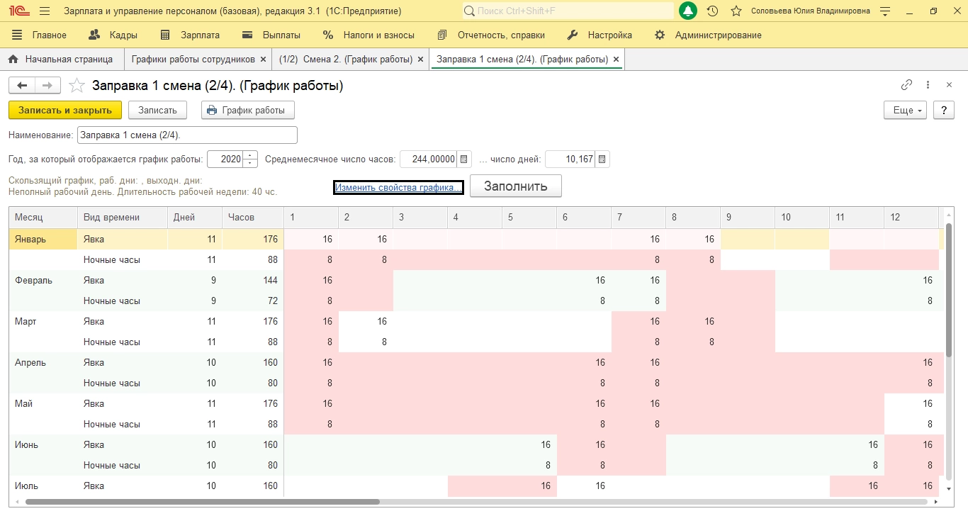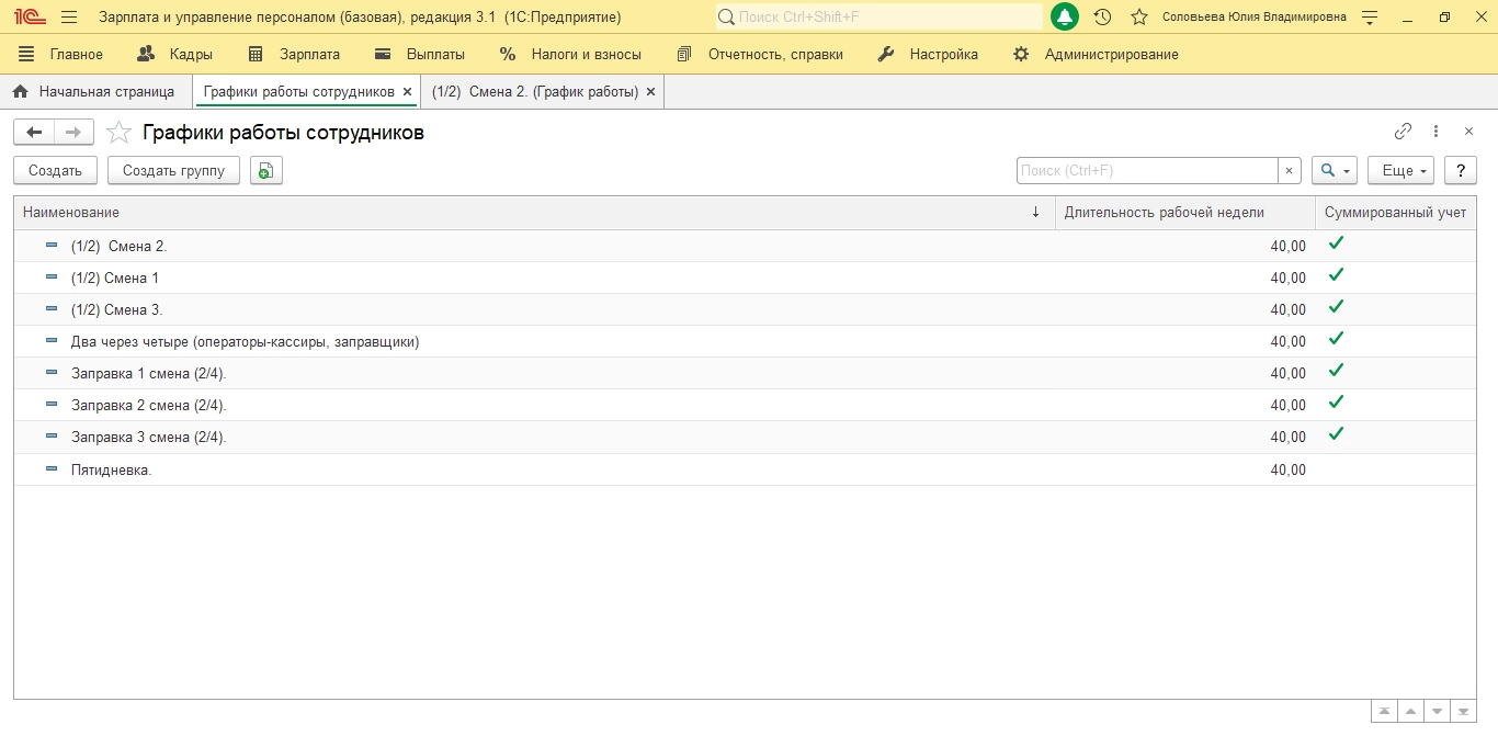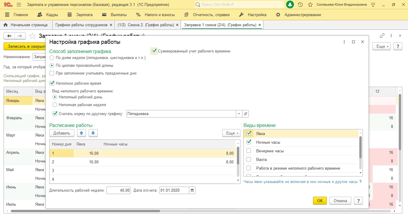 Именно из этих данных заполняется наш Табель. Пользователь может создавать свои графики, исходя из требований учета, выделять, ночные часы, смены и делать свои настройки. Наш опыт автоматизации кадрового учета на базе 1С:ЗУП подтверждает, что даже самые сложные схемы учета отработанного времени можно без проблем реализовать в программе посредством простой настройки.