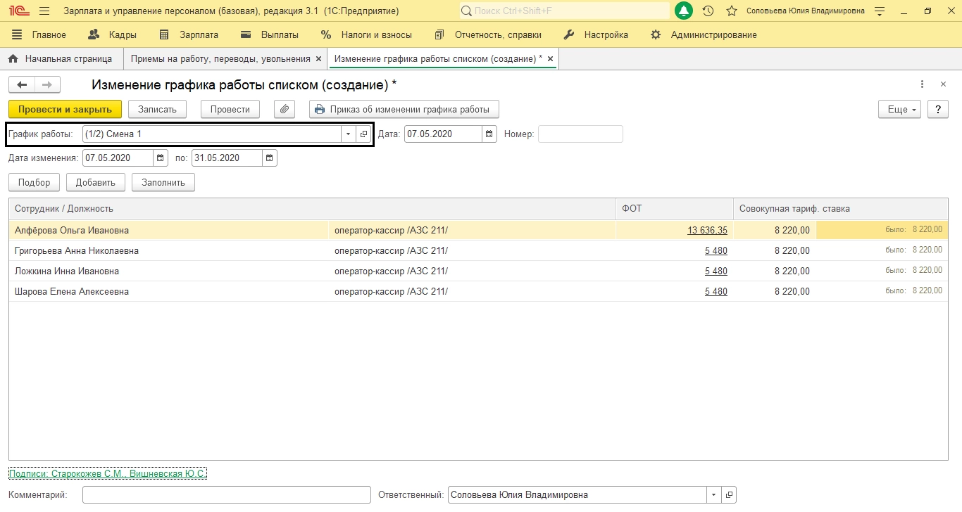 Его можно изменить и списку сотрудников, создав кадровый приказ в разделе меню «Кадры - Приемы на работу, переводы, увольнения».