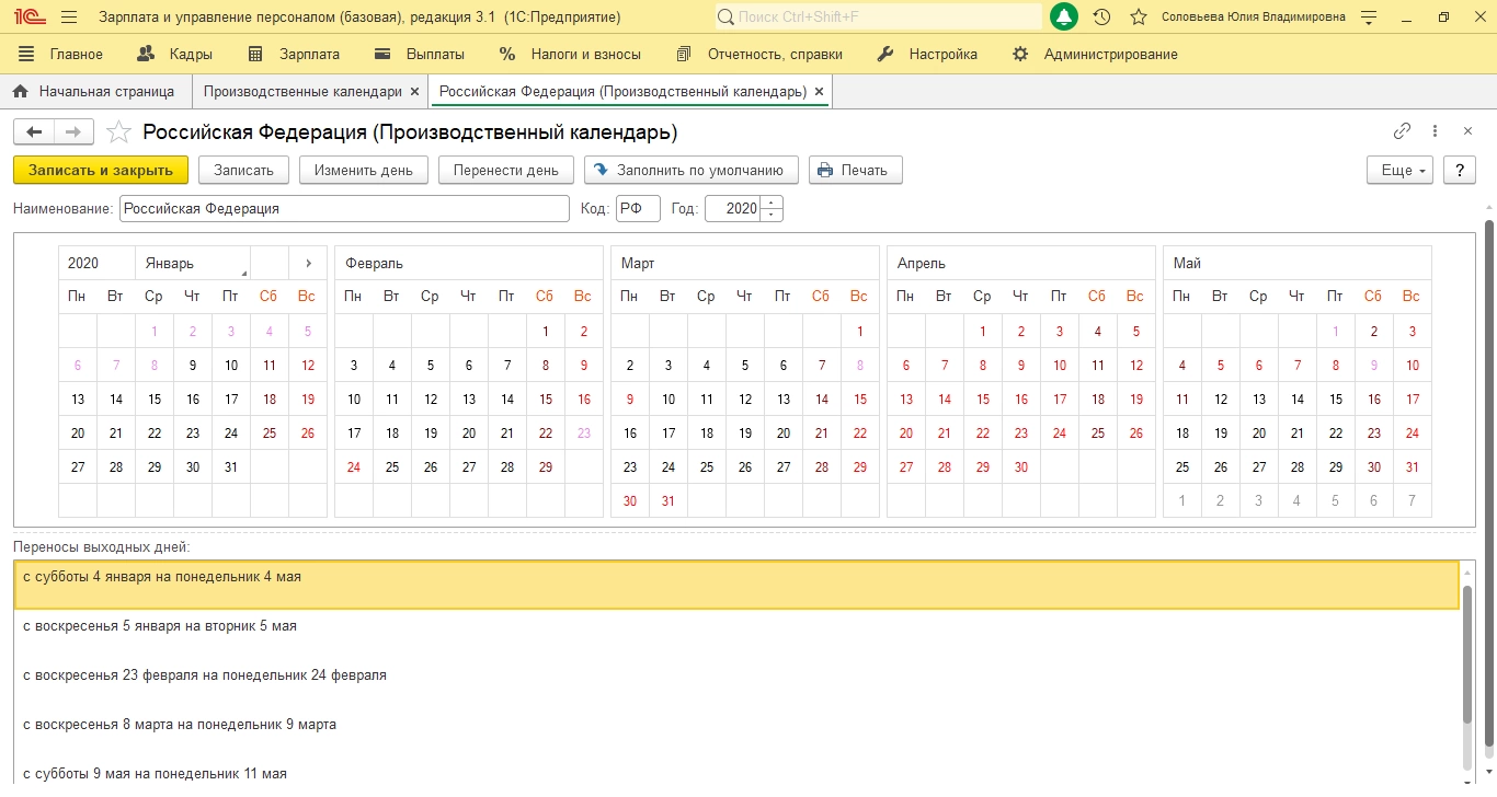 Производственный календарь обновляется автоматом при подключенной интернет-поддержке. Отметим, что в рамках услуг по сопровождению 1С, которые предлагает наша компания, вам не придется беспокоиться о своевременном обновлении программы и соответствии ее функционала законодательным новшествам.