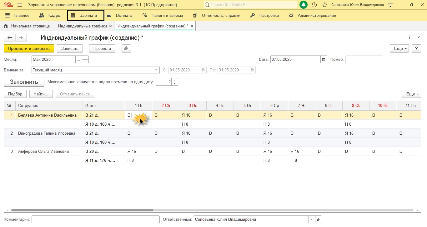 В программе 1С:ЗУП есть возможность ввода индивидуального графика. Он вводится, если работнику на определенный период необходимо изменить условия работы: перенести рабочие или выходные дни, установить сокращенные дни. Его временная норма при этом просчитывается на основе уже введенных данных, а не из основного графика, обозначенного в приказе. «Индивидуальный график» вводится в разделе «Зарплата-Учет времени». Заполнив сотрудниками, в табличной части пользователь задает им новый график. О том, что делать, если работника надо перевести на почасовую оплату труда в 1С:ЗУП, читайте также на нашем сайте.