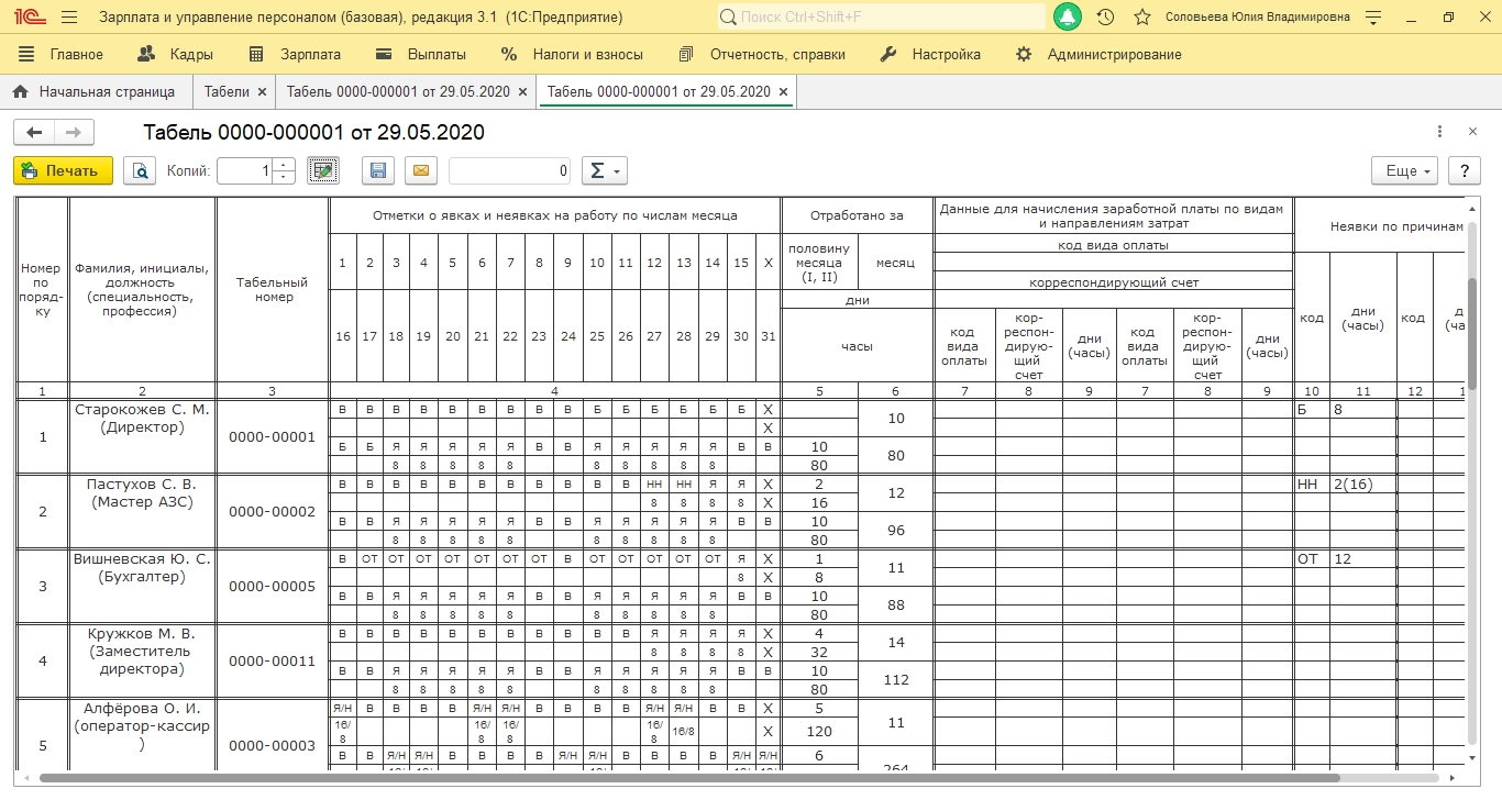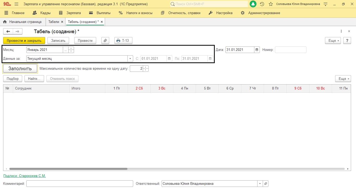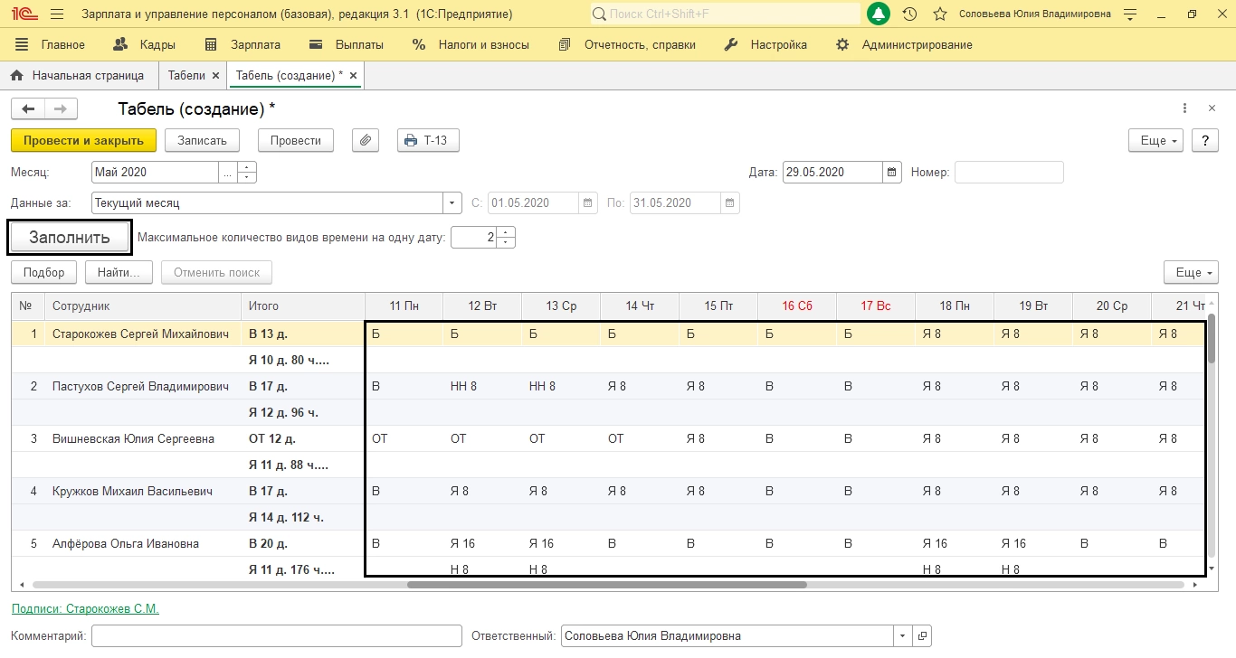Проведите документ («Провести») и нажмите кнопку Т-13 – это печать документа. Табель сформирован.