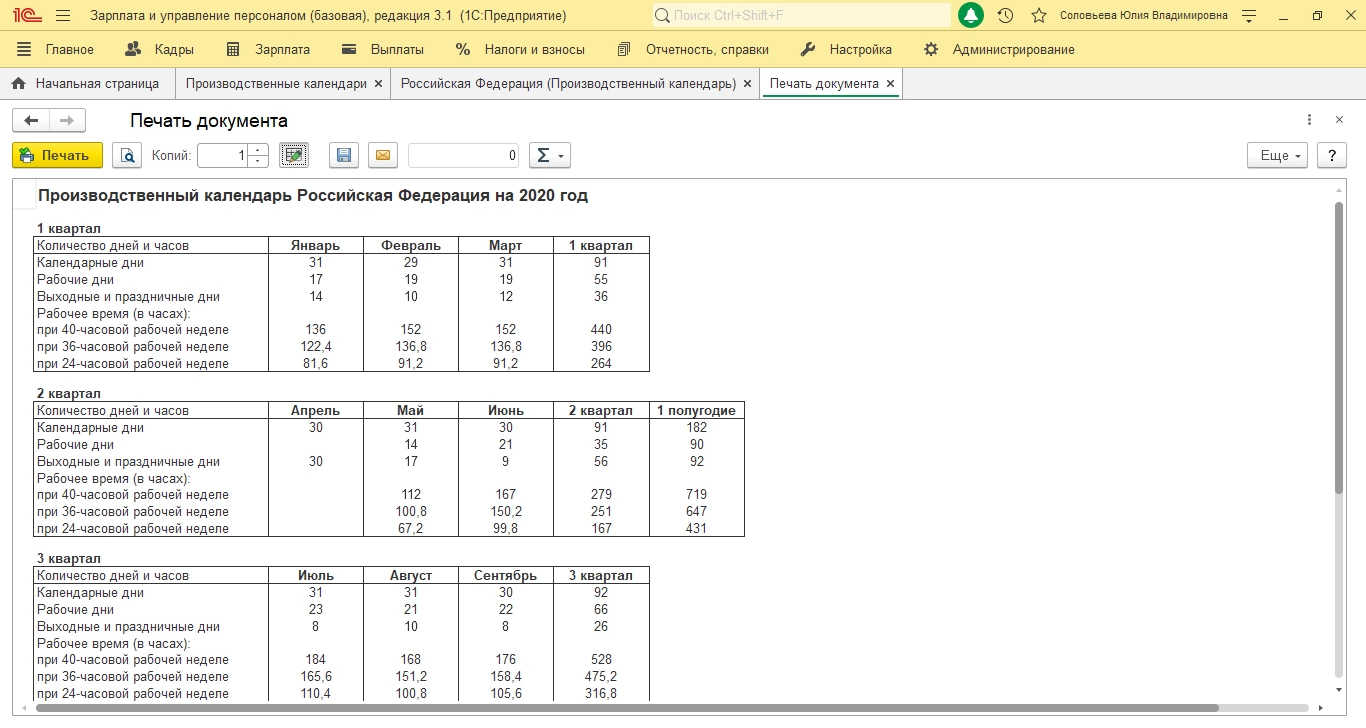 Исходя из него, также определяется норма отработок. Нажав «Печать» в календаре, можно увидеть таблицу временных норм, календарные, рабочие и выходные дни для каждого месяца и квартала.