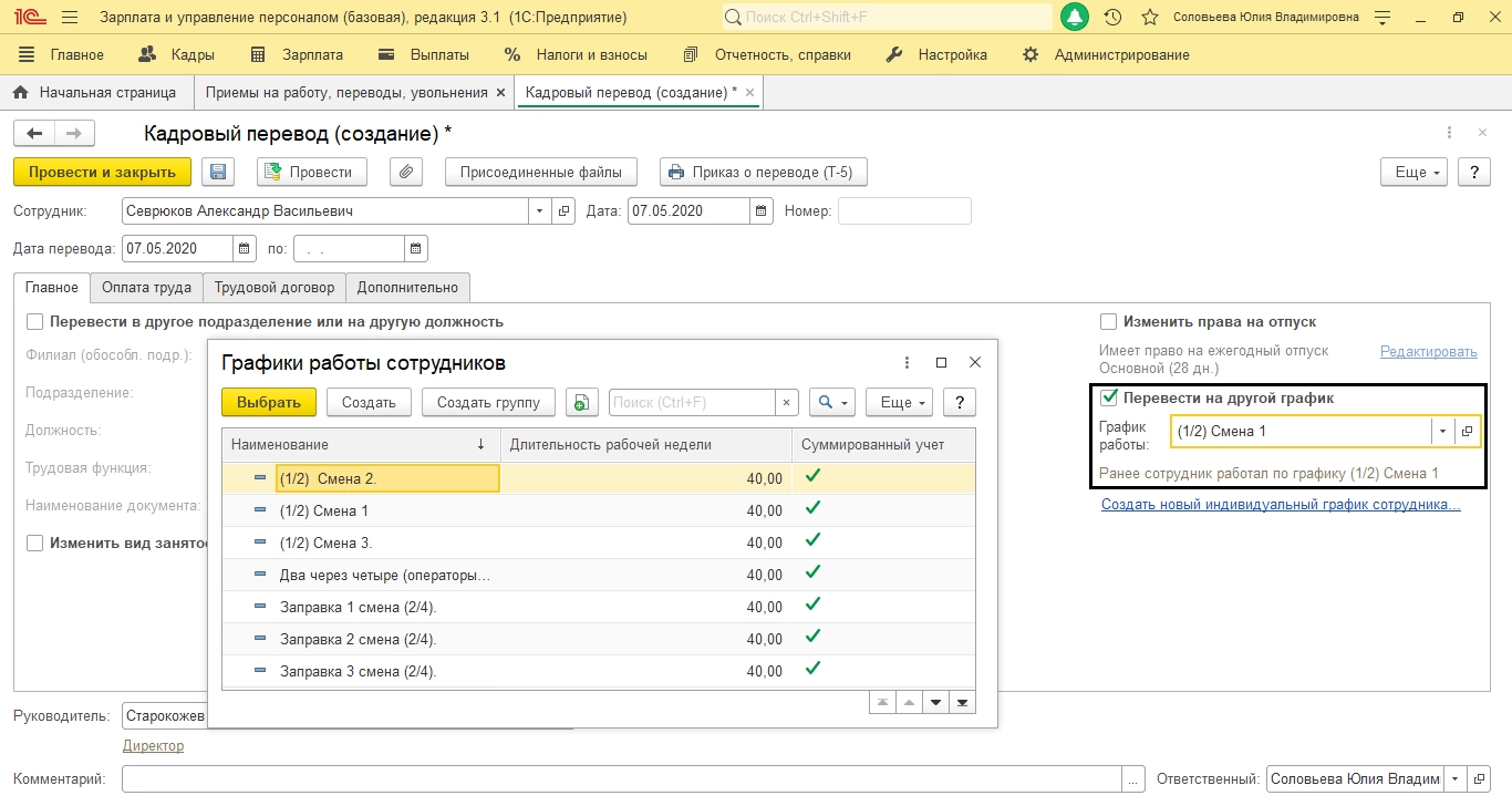 График задается сотруднику при приеме на работу, и может быть скорректирован документом «Кадровое перемещение».