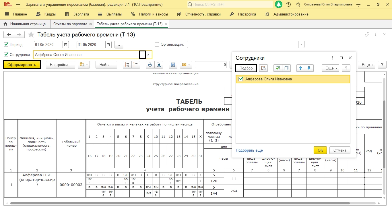 Как отчет табель формируется как по всем работникам, так и по специально заданному перечню. Подобрать в него кандидатов можно по нажатию кнопки «Подбор».