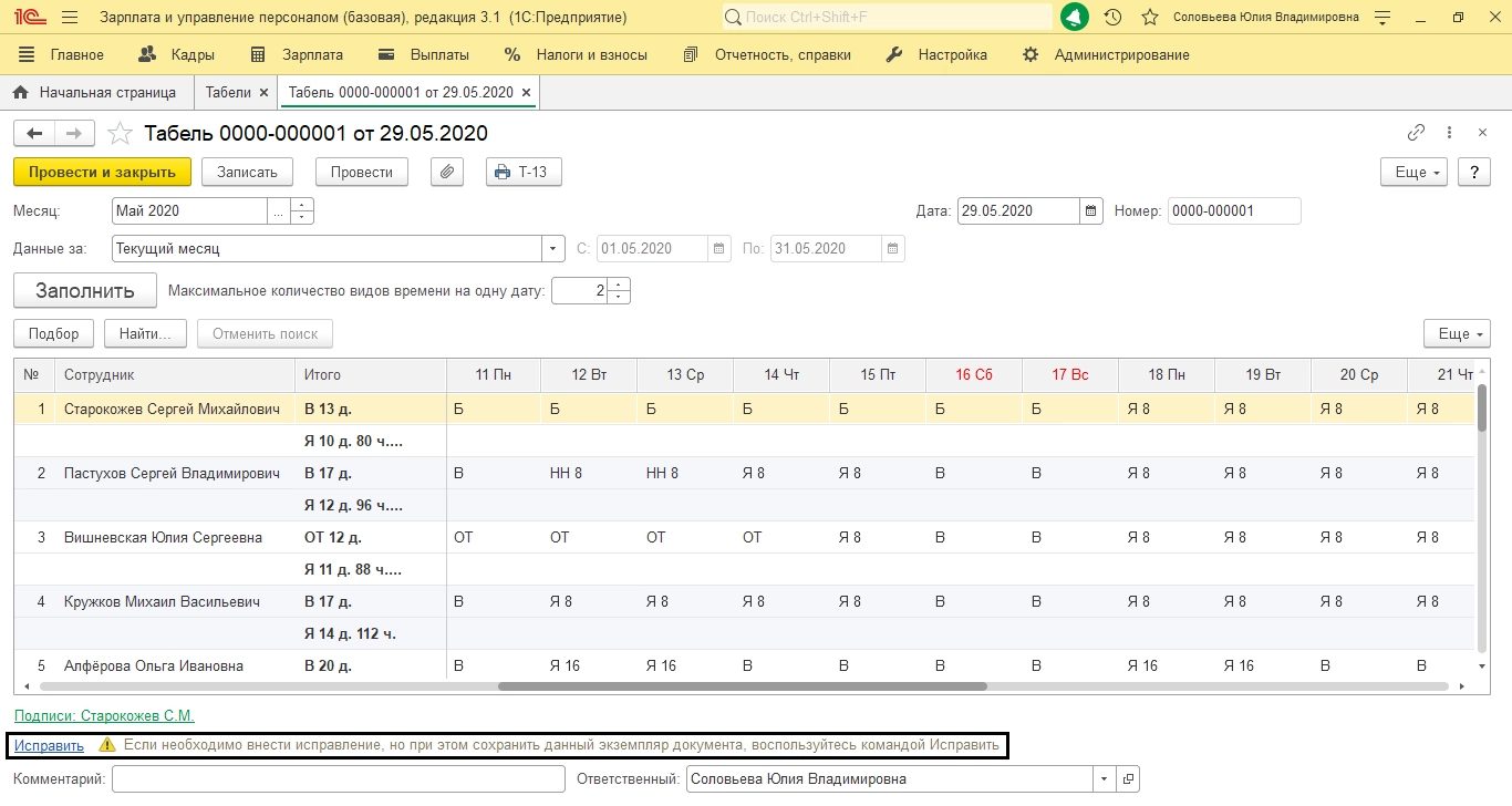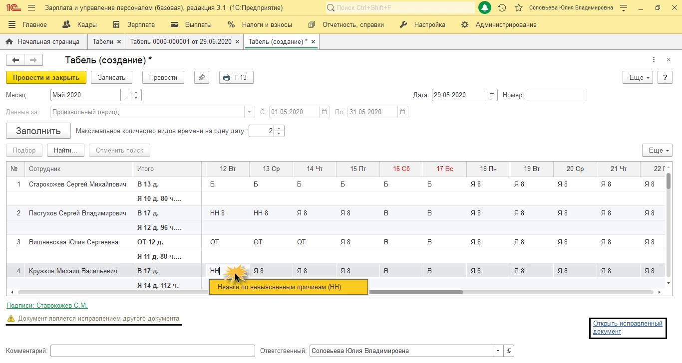 Для изменений в уже сформированном табеле сотрудника, создается корректирующий табель. Для его появления в нижней части документа нужно нажать гиперссылку «Исправить».