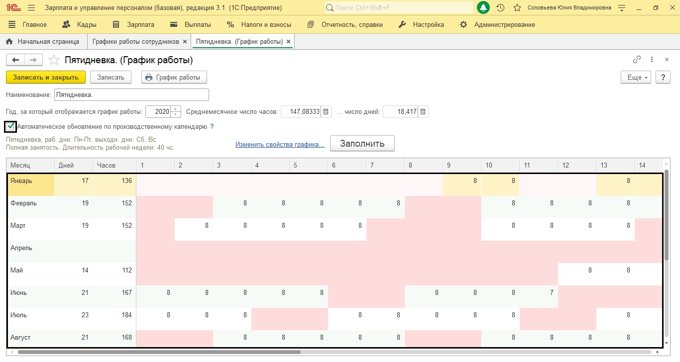 Открыв «Графики», мы видим, что в 1С:ЗУП создан график «Пятидневка», где по месяцам, отражены рабочие и выходные дни согласно загруженному календарю.