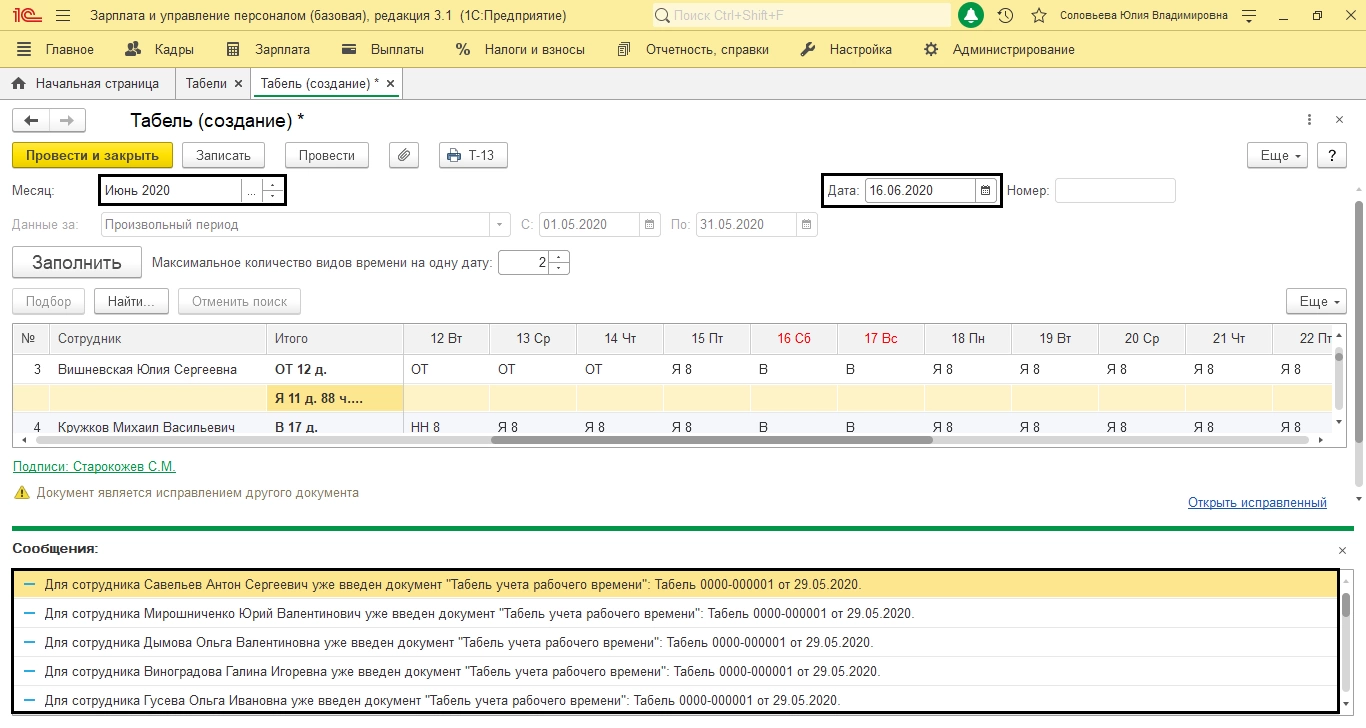 Заметим, что исправления таким образом вносятся, после закрытия периода расчета. Если нужно исправить табель за этот месяц, то просто правят документ (табель), поскольку по сотруднику невозможно ввести два табеля за один месяц. Если это попытаться сделать, всплывет ошибка с предупреждением.