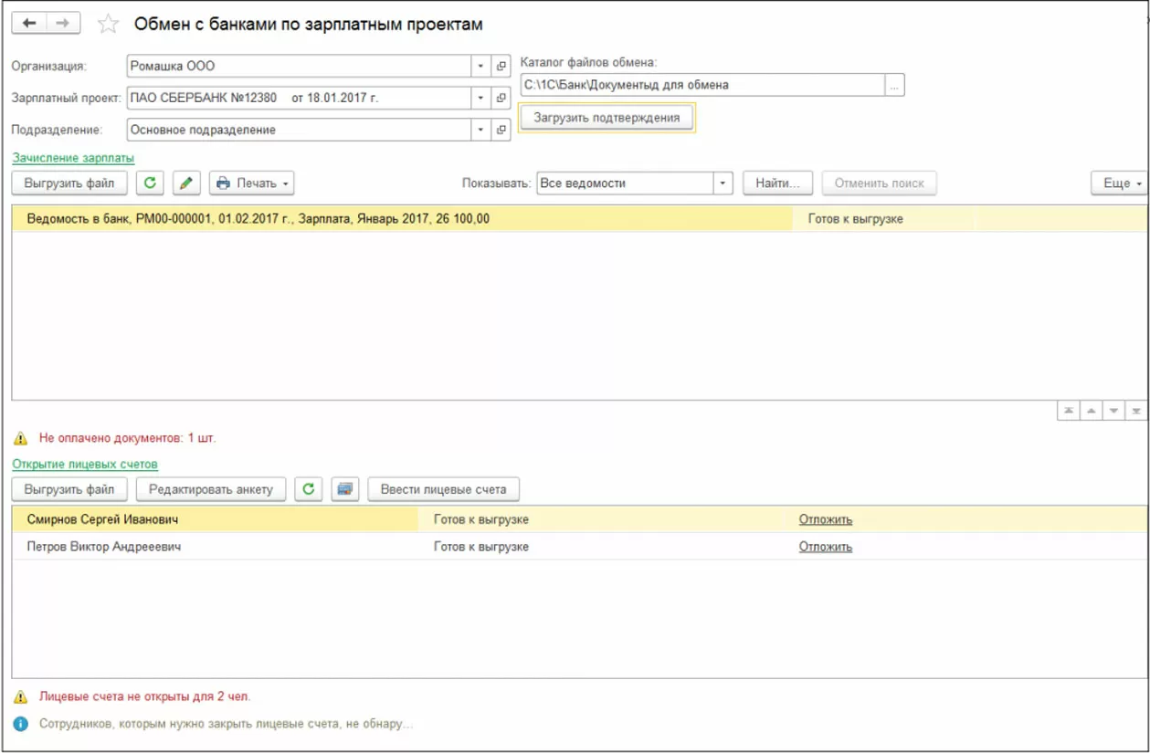 После того как из банка придут подтверждения с данными ЛС, их вводят в базу программы. Для этого нажимается кнопка «Загрузить подтверждения» и выбираются файлы с подтверждением. После чего автоматически будет создан и проведен документ «Подтверждение открытия счетов», в котором будет список сотрудников, их ЛС и статус счетов (открыт, закрыт, отказ). В карточку сотрудника будет автоматически записана информация по счету.
