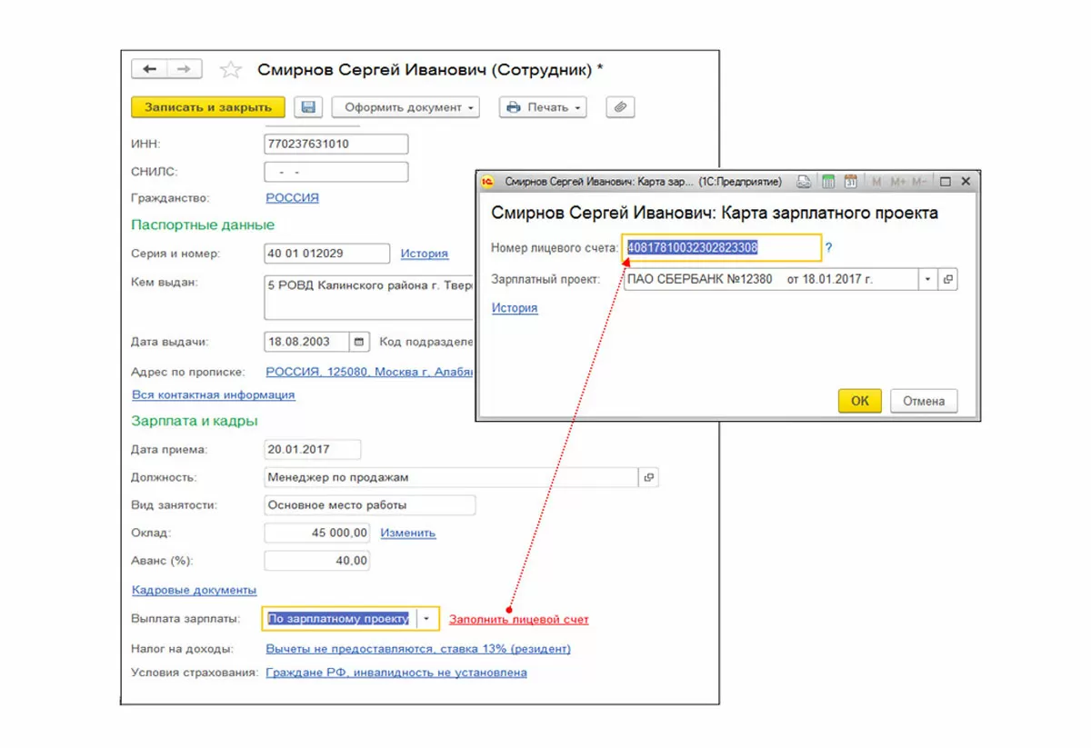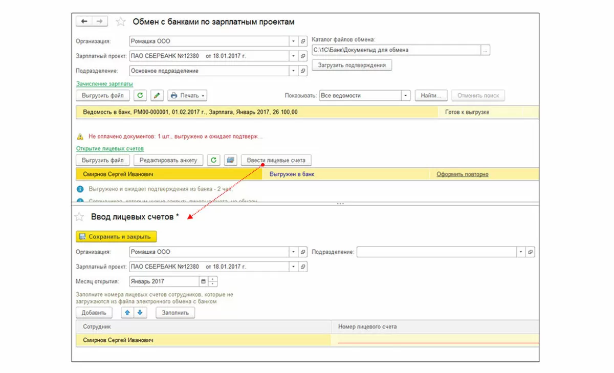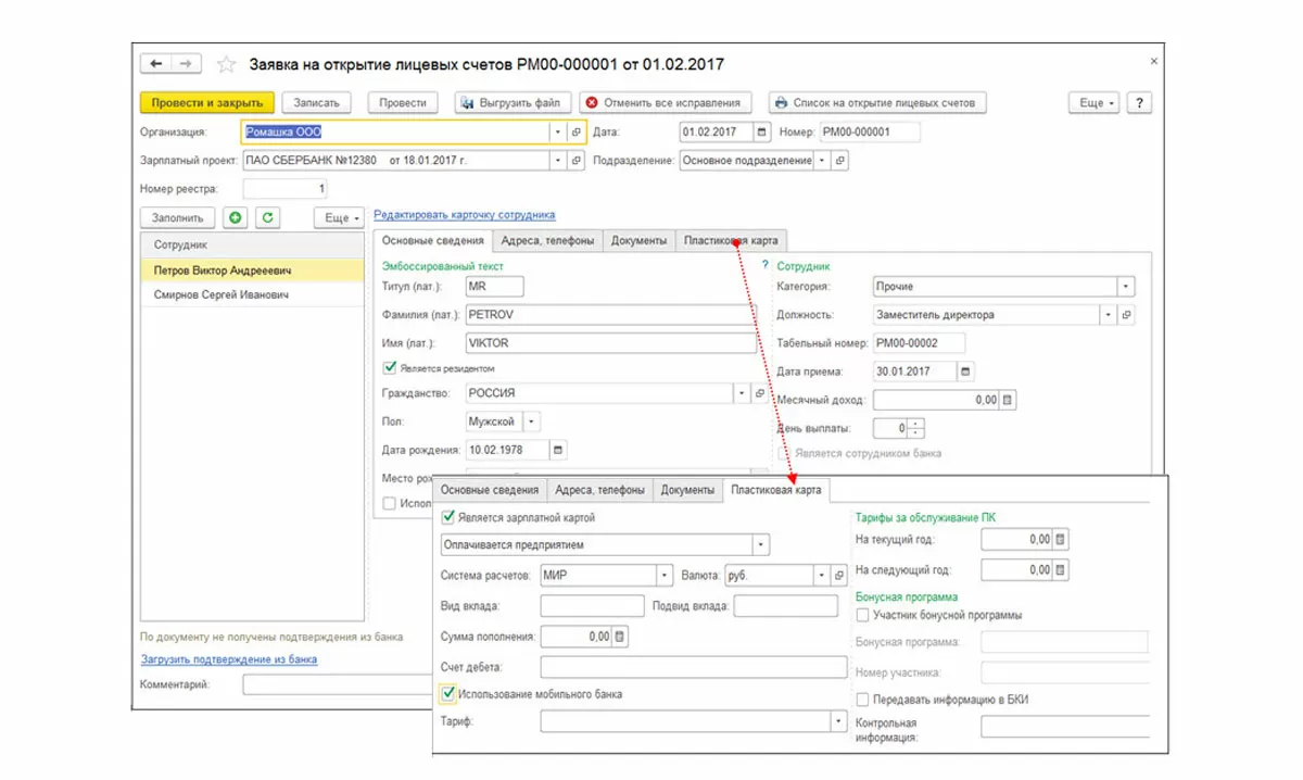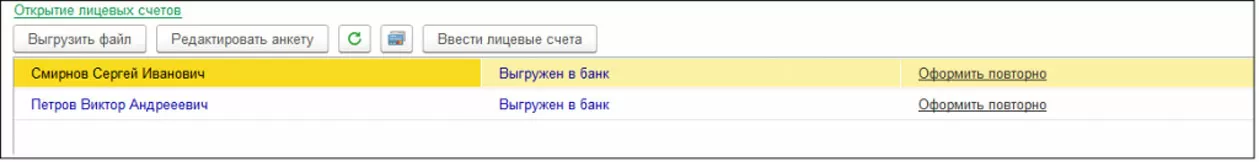 Как уже говорилось, при загрузке подтверждения открытия счетов в карточках сотрудников отобразятся ЛС.