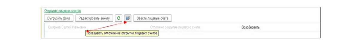Также можно временно отменить выгрузку для определенных работников, щелкнув в списке по слову-ссылке «Отложить» в строке с выбранным человеком. При этом статус строки изменится на отложенный, а слово изменится на «Возобновить». При необходимости можно скрывать или показывать строки с отложенным статусом кнопкой «Показывать отложенное открытие лицевых счетов». По умолчанию такие строки не видны. Данные по сотрудникам с таким статусом не выгружаются и в заявки не исчезают.
