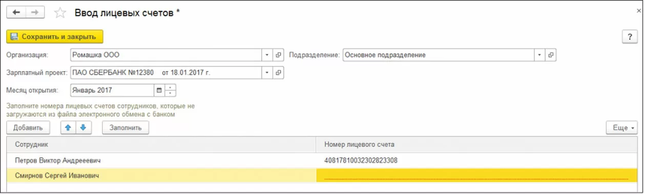 Большое количество ЛС правильно и удобно делать посредством документа с тем же название «Ввод лицевых счетов». Перейти в меню «Зарплата и кадры – Зарплатные проекты – Ввод лицевых счетов». В открывшейся форме в имеющихся полях задать организацию, ЗП и месяц открытия счетов. При необходимости дополнительно задать подразделение. Нажатие кнопки «Заполнить» приведет к появлению в таблице списка лиц, у которых нет счета. При этом можно добавить их вручную после нажатия «Добавить». Далее ввести номера ЛС и сохранить документ. Такой способ ввода позволяет ввести сразу большое количество счетов, например, при смене ЗП.