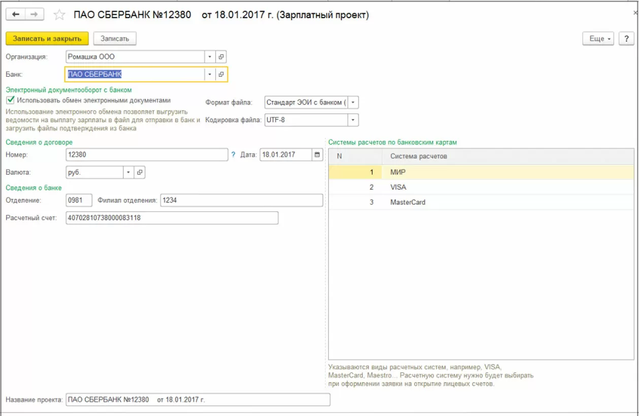 Таблица «Системы расчетов по банковским картам» является справочной и заполняется вручную. Вводятся системы платежей, поддерживаемые выбранным банком. Эти сведенья понадобятся в момент подачи заявки в банк на открытие ЛС работникам. После заполнения всех полей сохранить документ.