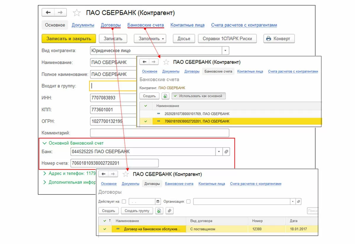 Для начала в «Контрагенты» (перейти в меню «Справочники – Покупки и продажи – Контрагенты») заносится новый контрагент – банк, с которым заключен договор на ЗП. Если банк уже есть в этом справочнике, достаточно открыть его карточку.