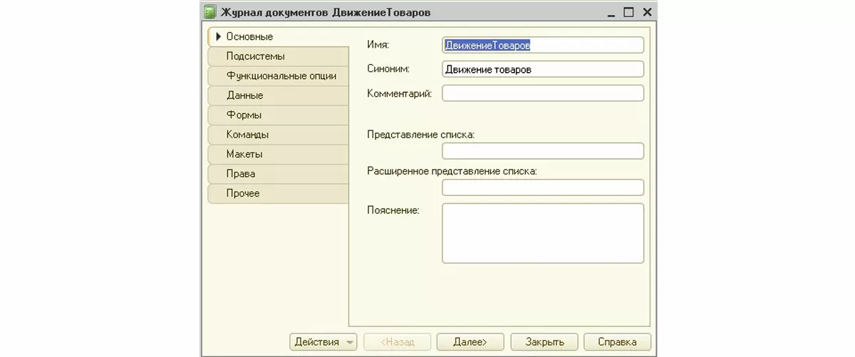 - Создаем новый журнал документов с помощью зеленой кнопки с белым плюсом («Добавить») и заполняем реквизиты на вкладке «Основные». Также не забудьте включить наш журнал документов в одну из подсистем конфигурации на вкладке «Подсистемы»;