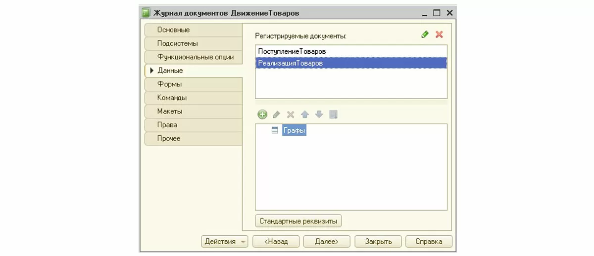 - Переходим на вкладку «Данные». Здесь нам предстоит выполнить основные настройки для журнала документов. В верхней части нужно указать, какие документы будут внесены в журнал с помощью кнопки «Изменить». Нижняя половина под названием «Графы» предназначена, чтобы разработчик указал реквизиты различных документов, которые необходимо объединить в 1 столбец. По умолчанию существуют стандартные реквизиты, общие для всех документов в платформе 1С:
