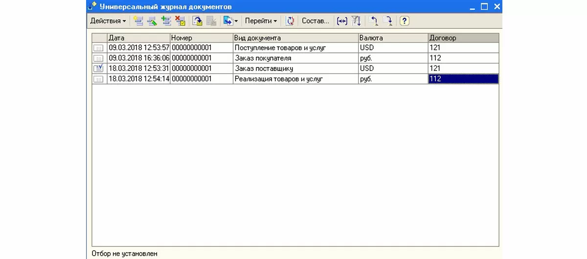 Вышеописанный метод создания журнала документов отлично подойдет для создания перечня, которым будут пользоваться регулярно. Но иногда нужно сделать список из документов для единственной задачи. В этом случае ставить задачу программистам 1С и изменять конфигурацию нецелесообразно. Разработчики компании 1С в своих типовых решениях сделали отличный инструмент для простых пользователей – универсальный журнал документов.