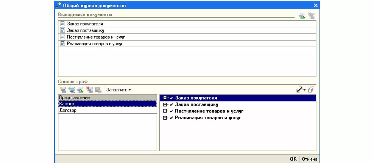 Графы добавляются в нижней половине – в левом списке наименование, а справа – в составе каждого документа нужно отметить галкой соответствующий реквизит. При отметке напротив каждого выбранного вида документа ставится галка. Таким образом, свернув реквизиты, можно увидеть, в каких типах уже установили соответствующий реквизит, а в каких еще нет. Полученная схема и является настройкой универсального журнала, которую можно сохранить.