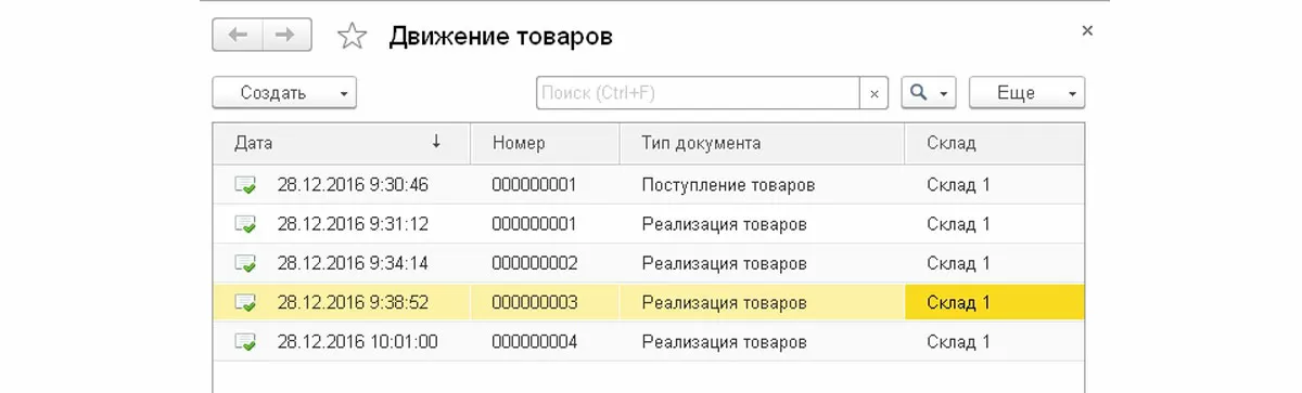 Сохранив конфигурацию и запустив 1С в режиме «Предприятие», мы увидим, что в нужной подсистеме появилась ссылка на открытие нашего нового журнала документов. Открыв ее, мы увидим не только стандартные реквизиты всех документов в 1С, но и те графы, которые мы заполнили.