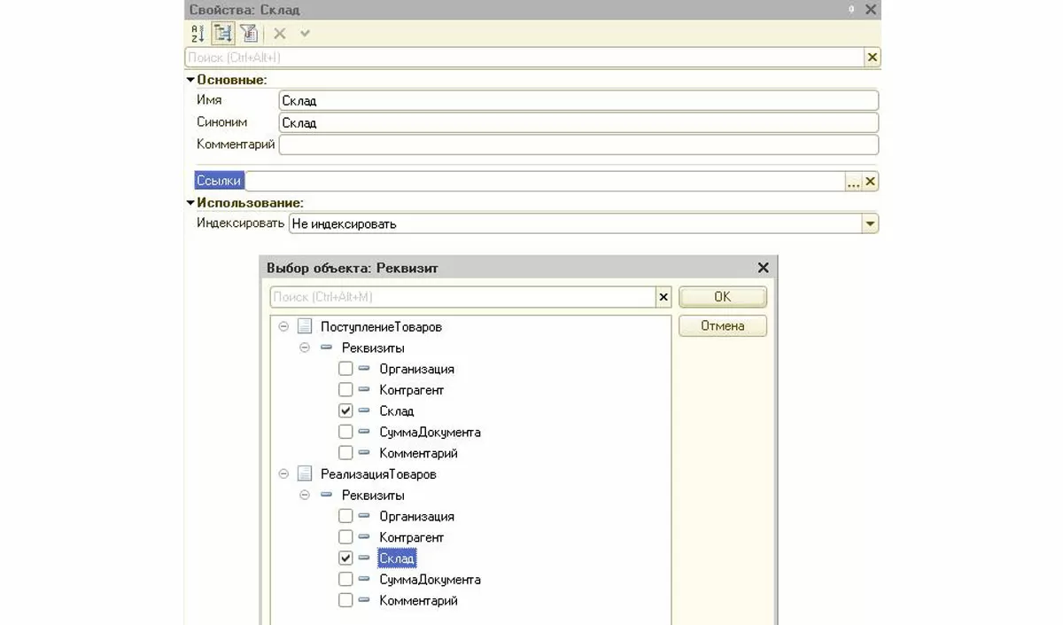 - При добавлении граф важно указать, какие реквизиты всех документов, входящих в журнал, будут попадать в них. Указывают эти данные через свойство графы в поле «Ссылки». Если вы пропустите какой-либо тип документа, то в режиме Предприятие 1С увидите пустое поле напротив пропущенных документов;