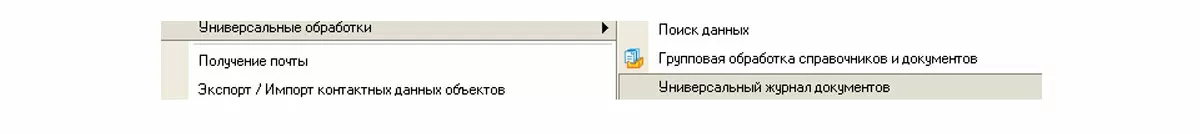 Данный функционал позволяет решать такие же задачи, но его необходимо настраивать. Впрочем, настройки вы можете сохранить и вызвать в любой момент, а использовать в этом функционале вы сможете любые документы. В обычном журнале, созданном в конфигураторе, можно просматривать только документы, предусмотренные настройками. Чтобы воспользоваться механизмом универсального журнала, необходимо для начала его открыть. Чаще всего он расположен в меню «Сервис» - «Универсальные обработки».