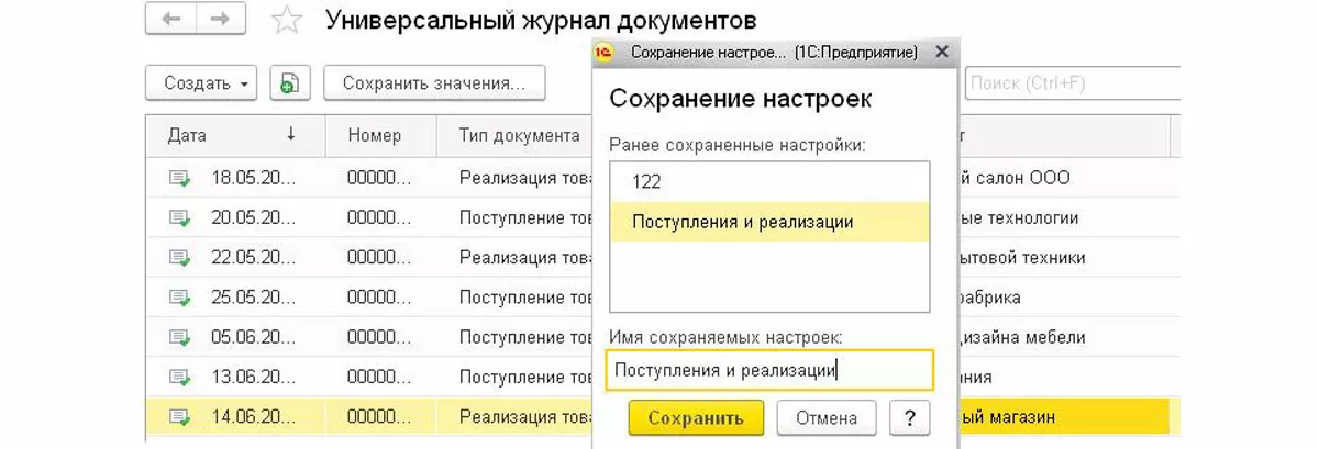 После утверждения созданной схемы мы получим перечень документов выбранных типов. Если впоследствии нужны будут изменения, то достаточно опять вывести окно настройки и отредактировать графы или список документов. Работа с журналом документов ничем не отличается в обоих случаях. Вы можете настраивать отборы, открывать документы, изменять их, создавать новые и так далее.