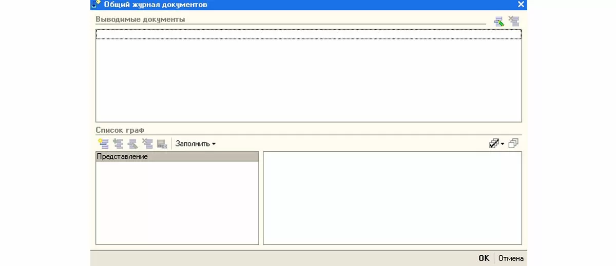 При открытии мы видим пустую таблицу, которую нам предстоит заполнить. Если это первый запуск, то никаких сохраненных настроек нет, и придется самостоятельно все заполнять. После нажатия кнопки «Действия» - «Состав документов и граф журнала», в открывшемся меню следует выбрать нужные нам типы документов и их поля.