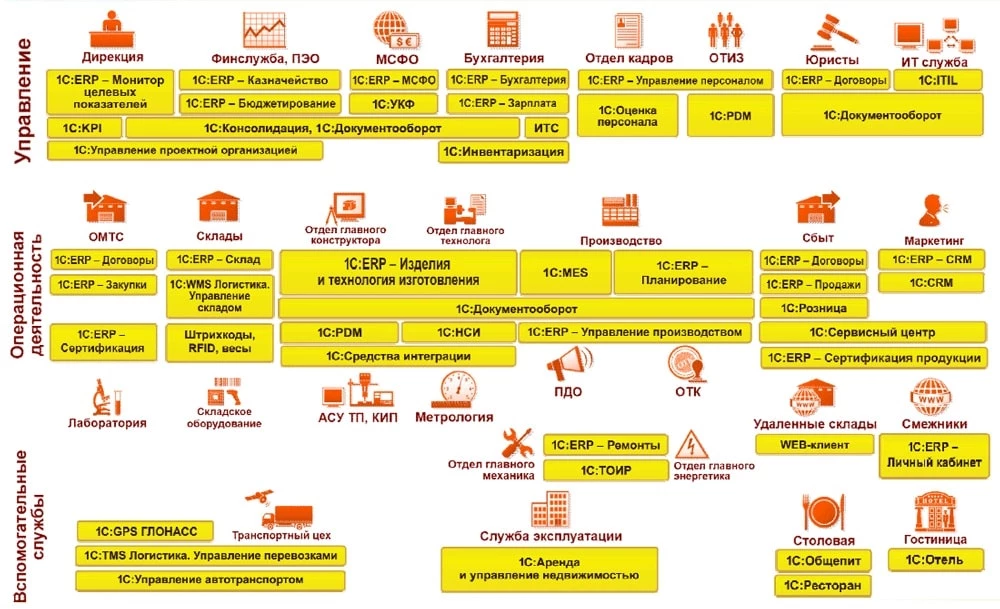 1С:ERP подходит для автоматизации средних и крупных производственных компаний, торговли, автоматизации сферы услуг, финансового сектора, с/х, здравоохранения, строительства и других отраслей.