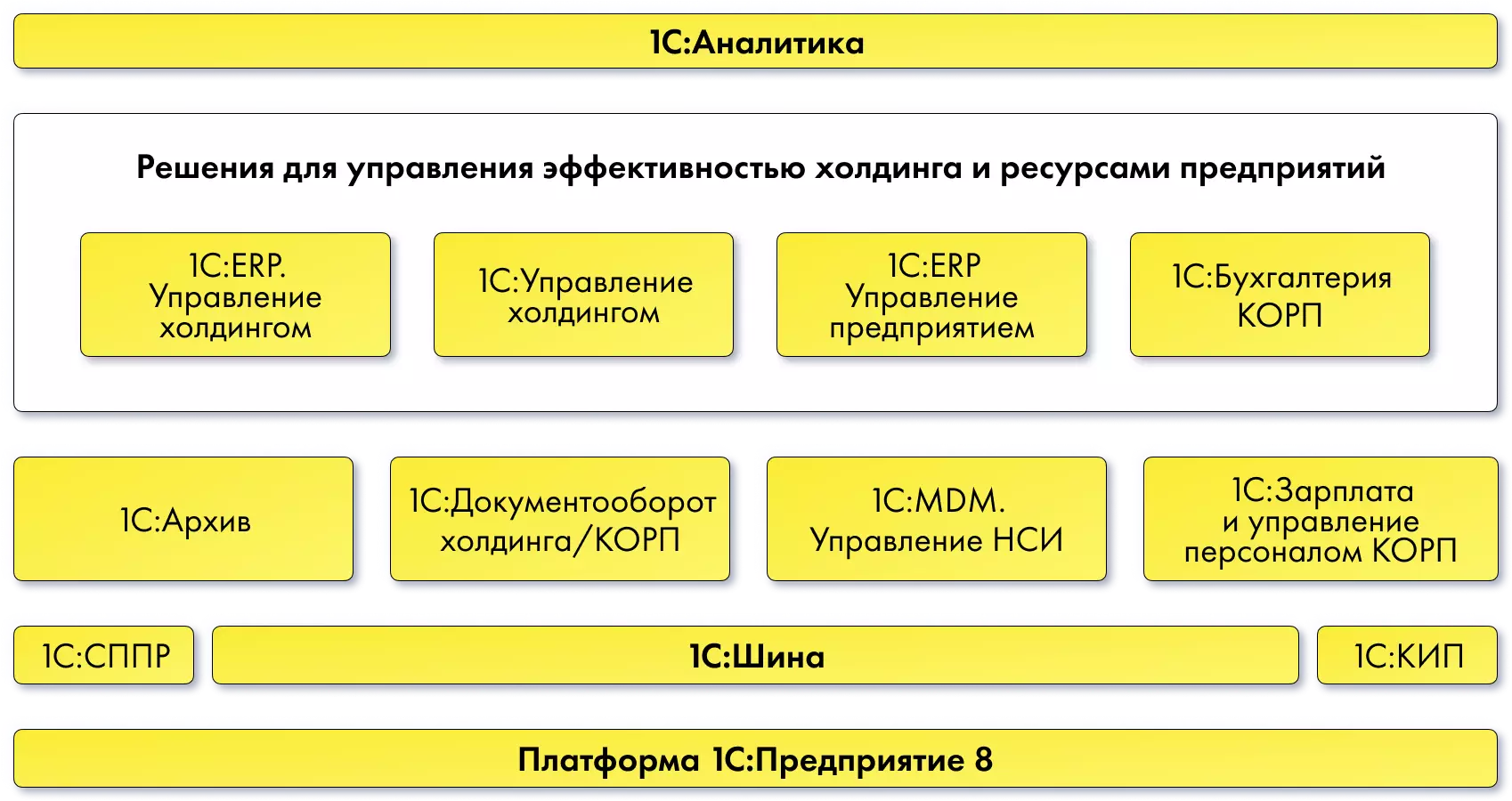 Линейка решений «1С» ежегодно пополняется, а текущий софт регулярно развивается, что позволяет использовать все больше оптимальных комбинаций для построения эффективной IT-инфраструктуры в холдинговых масштабах.