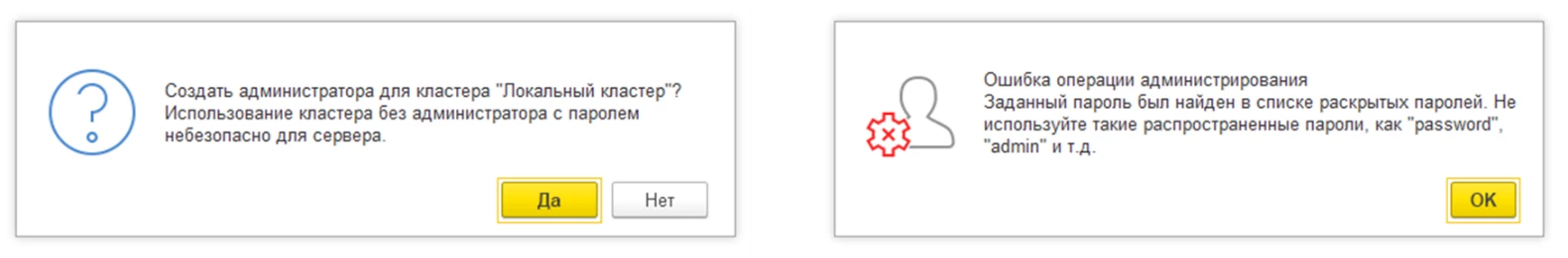 Также в новой версии 1С:Предприятие при создании сервера или кластера без указания администратора перед сохранением объекта всплывет предупреждение. Слабый пароль администратора тоже станет причиной информирования пользователя.