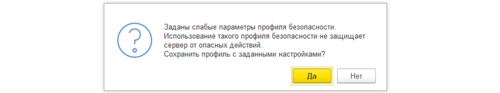 При сохранении профиля безопасности отобразится предупреждение, в случае недостаточного уровня безопасности, когда включены все галочки разрешения полного доступа.