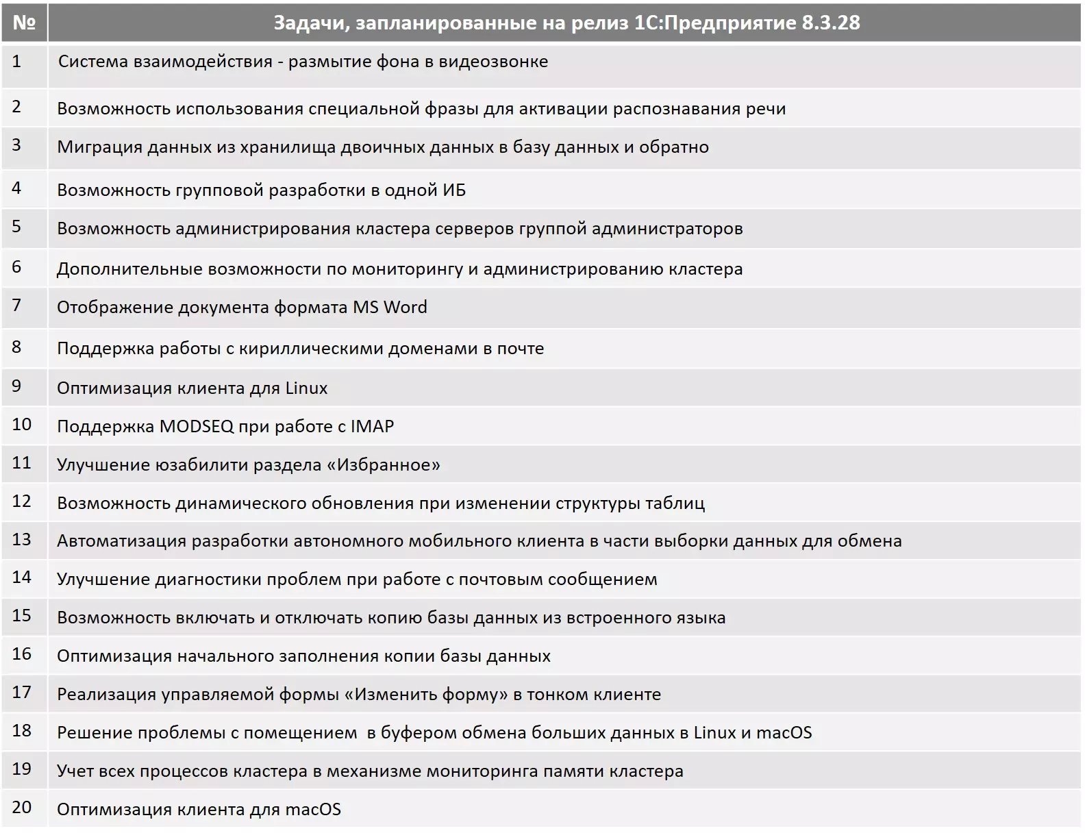 В техноблоге разработчиков 1С обновили планы на будущую версию платформы 8.3.28. Всего запланировано 20 задач для реализации.