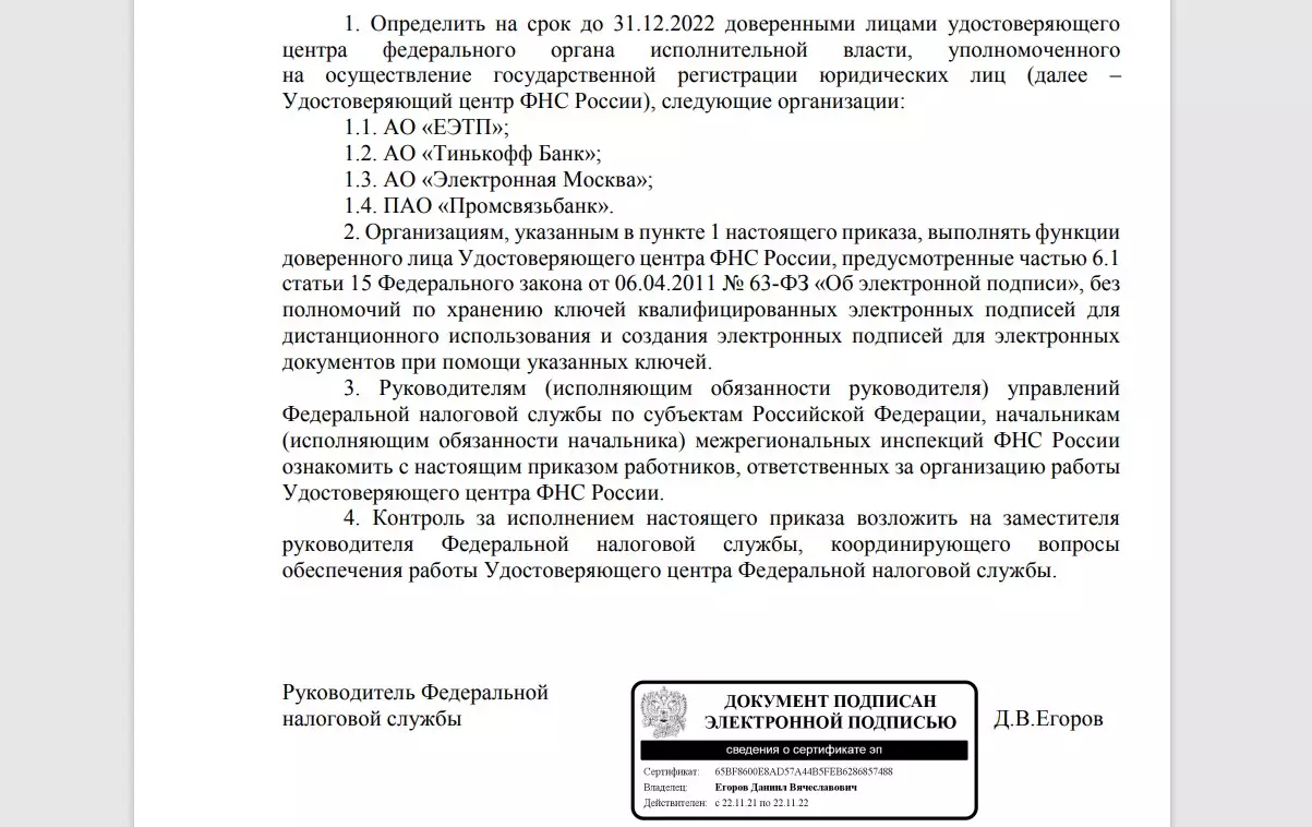 30 сентября руководителем ФНС подписан приказ об определении еще четырех доверенных лиц Удостоверяющего центра ФНС России. Ими стали: