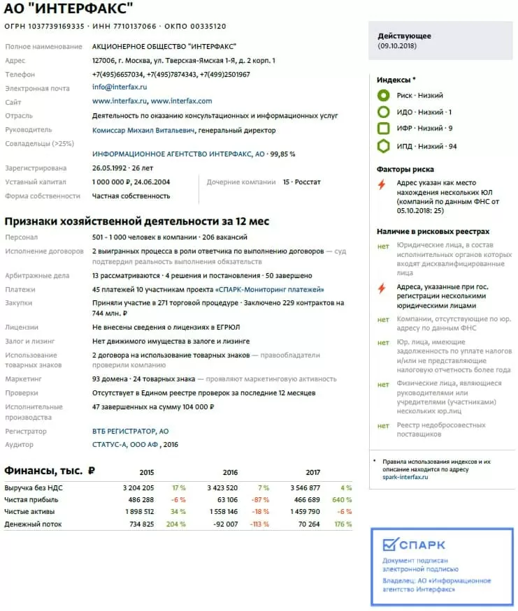 Однако сведения, предоставляемые «Рисками», более подробные и к тому же структурированные. Также упрощение формата информации через использование различных индексов контрагентов, позволяет «с лета» определить, насколько чистой является компания и не является ли она фирмой однодневкой.