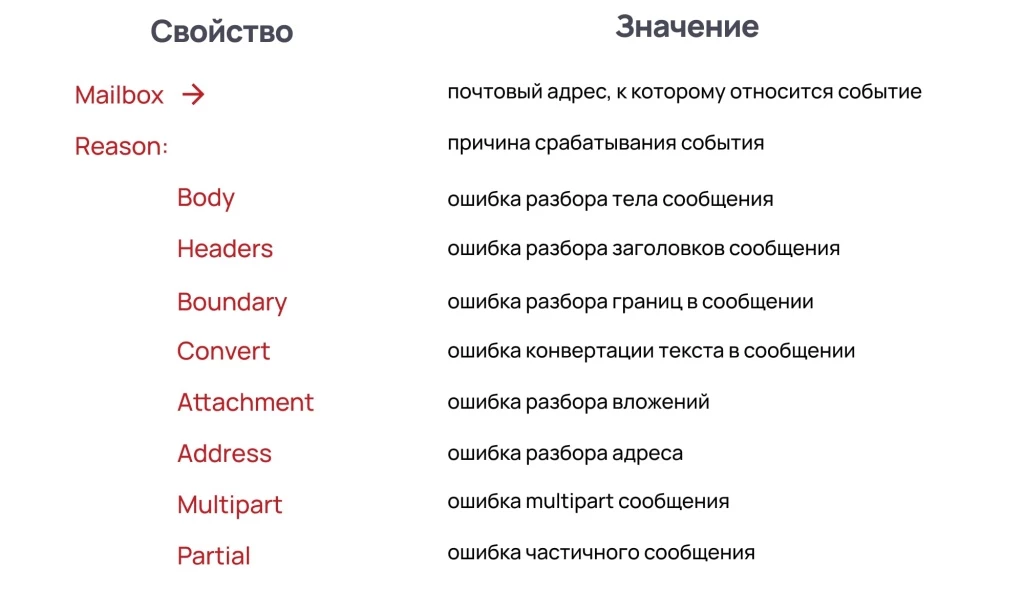 Помимо этого, в планах расширение логирования в журнал ошибок при разборе сообщений в почтовой подсистеме. В текущее событие MAILPARSEERR добавят свойства Mailbox и Reason, что позволит администраторам 1С выявлять причины ошибок при разборе почтового сообщения.