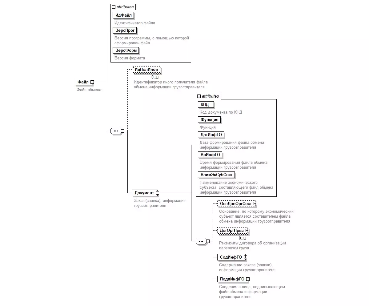 - Файл обмена информации грузоотправителя, куда войдут сведения об отправителе груза, об уполномоченных ими лицах, об адресах пунктов подачи транспорта, погрузки и выгрузки, сведения о грузе, о параметрах транспортного средства, необходимых для перевозки, а также об указаниях, необходимых для выполнения фитосанитарных, санитарных, карантинных и прочих требований, установленных законодательством РФ. Файл обмена подписывается УКЭП или УНЭП.