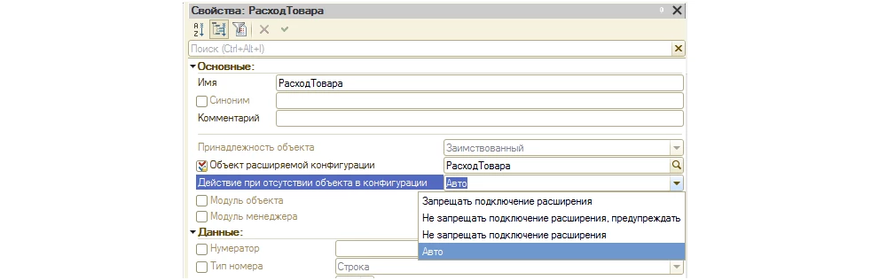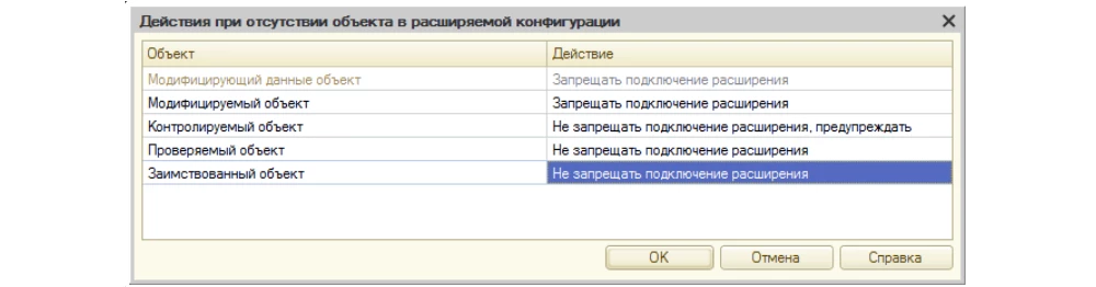 - Отсутствие заимствованного объекта у расширяемой конфигурации. Ранее, если в расширении использовался объект, отсутствующий в расширяемой конфигурации, расширение не применялось. В новой версии это можно будет настроить. Разработчики смогут задать поведение расширения при отсутствии заимствованного объекта.