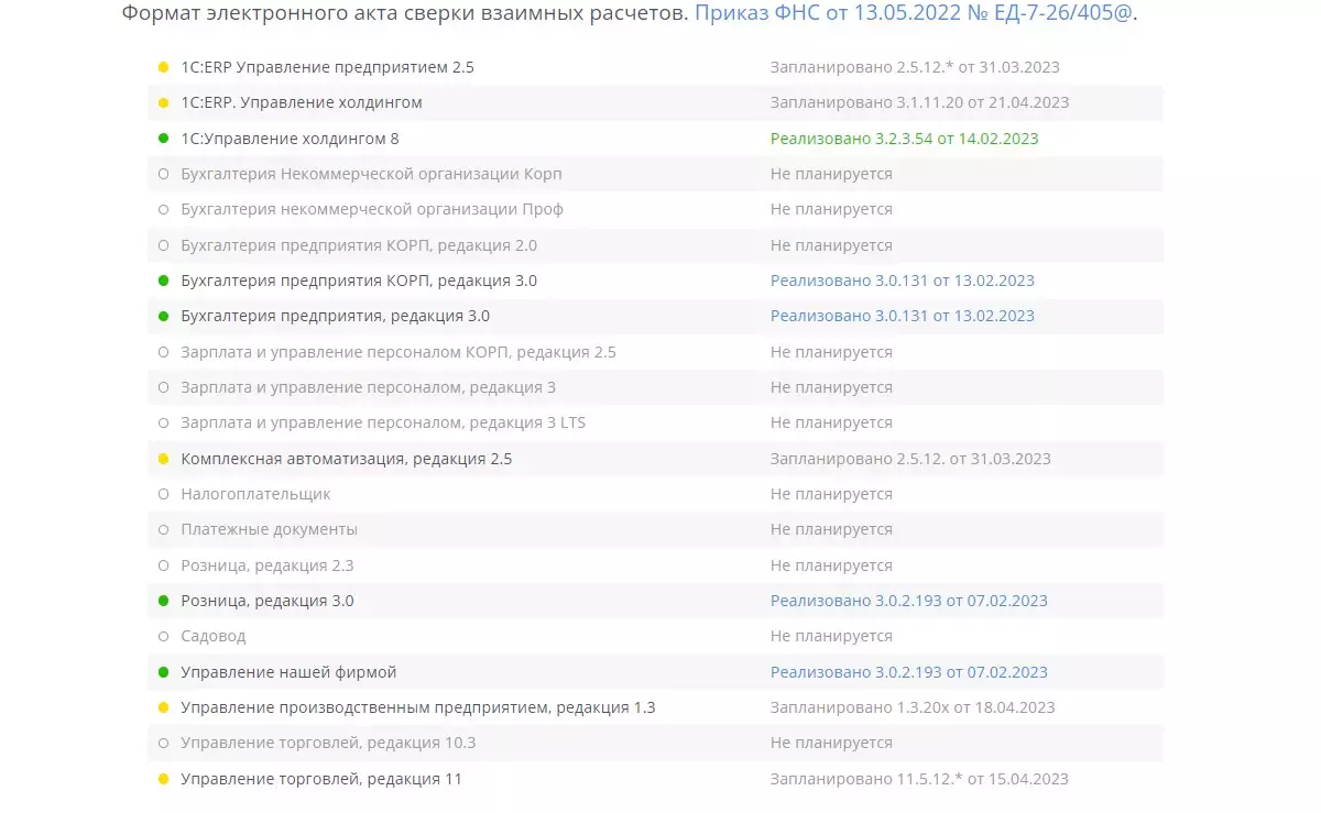 Поддержка нового формата акта сверки в электронном виде с февраля 2023-го реализована в конфигурациях: