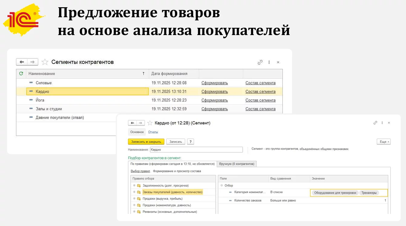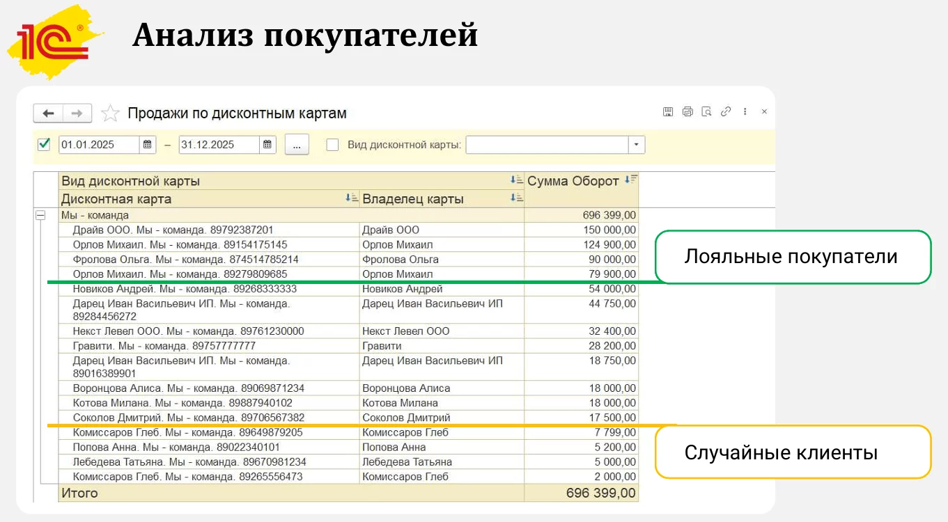 - Инструменты поддержки лояльности клиентов. Используйте все возможности 1С для роста продаж по повторным покупкам: