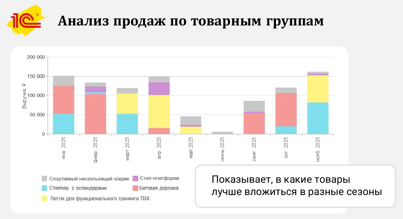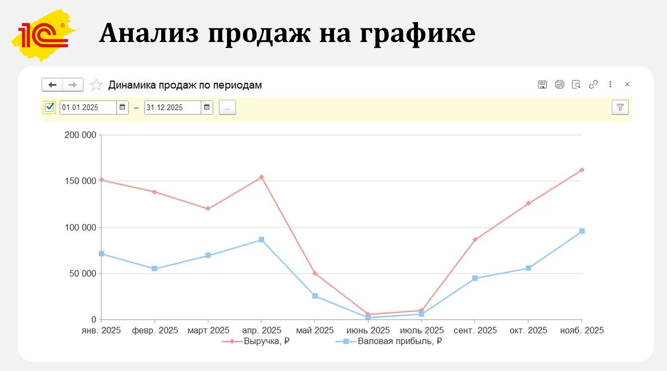 - Анализ продаж по периодам. Оценивайте результаты, отслеживайте динамику и сезонность.