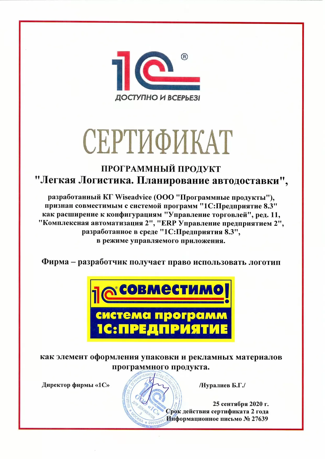 Продукт «Легкая Логистика. Планирование автодоставки», предназначенный для планирования маршрутов доставки товаров покупателям, а также на торговые точки или склады, получил сертификат фирмы 1С «Совместимо! Система программ 1С:Предприятие». «Легкая логистика» разрабатывается и тиражируется нашей компанией с этого года.